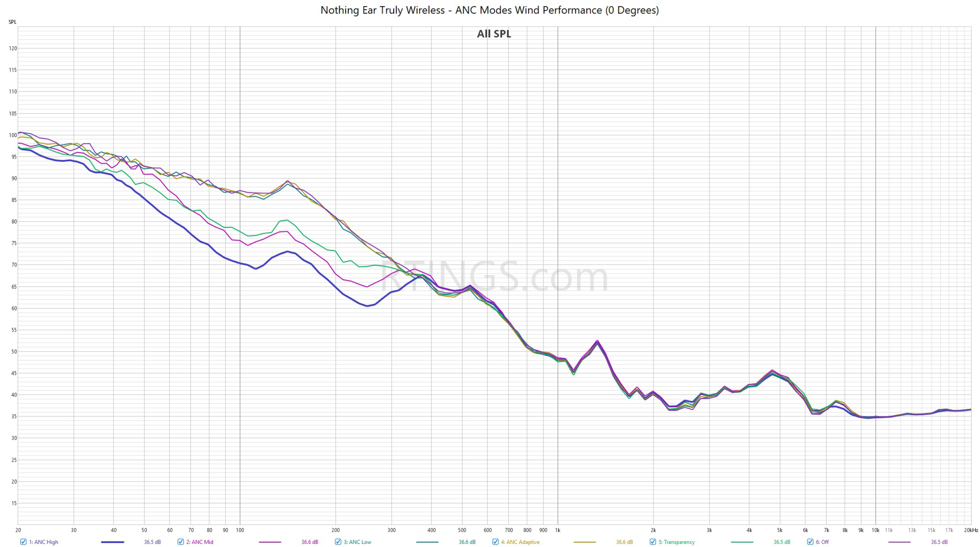 The Nothing Ear buds don't have a dedicated wind reduction mode. As a result, the 'anti-noise' created by the noise cancelling system and the wind interacting with external mics gets fed back into your ears and varies in loudness, depending on the angle of the wind. The buds handle wind noise best with the ANC at 'Max,' and as expected, if you decrease the ANC strength, they handle wind noise worse. It's worth noting that the Adaptive ANC mode handles noise worse than ANC manually set to 'Low.' You can also see how the other ANC modes handle wind.
