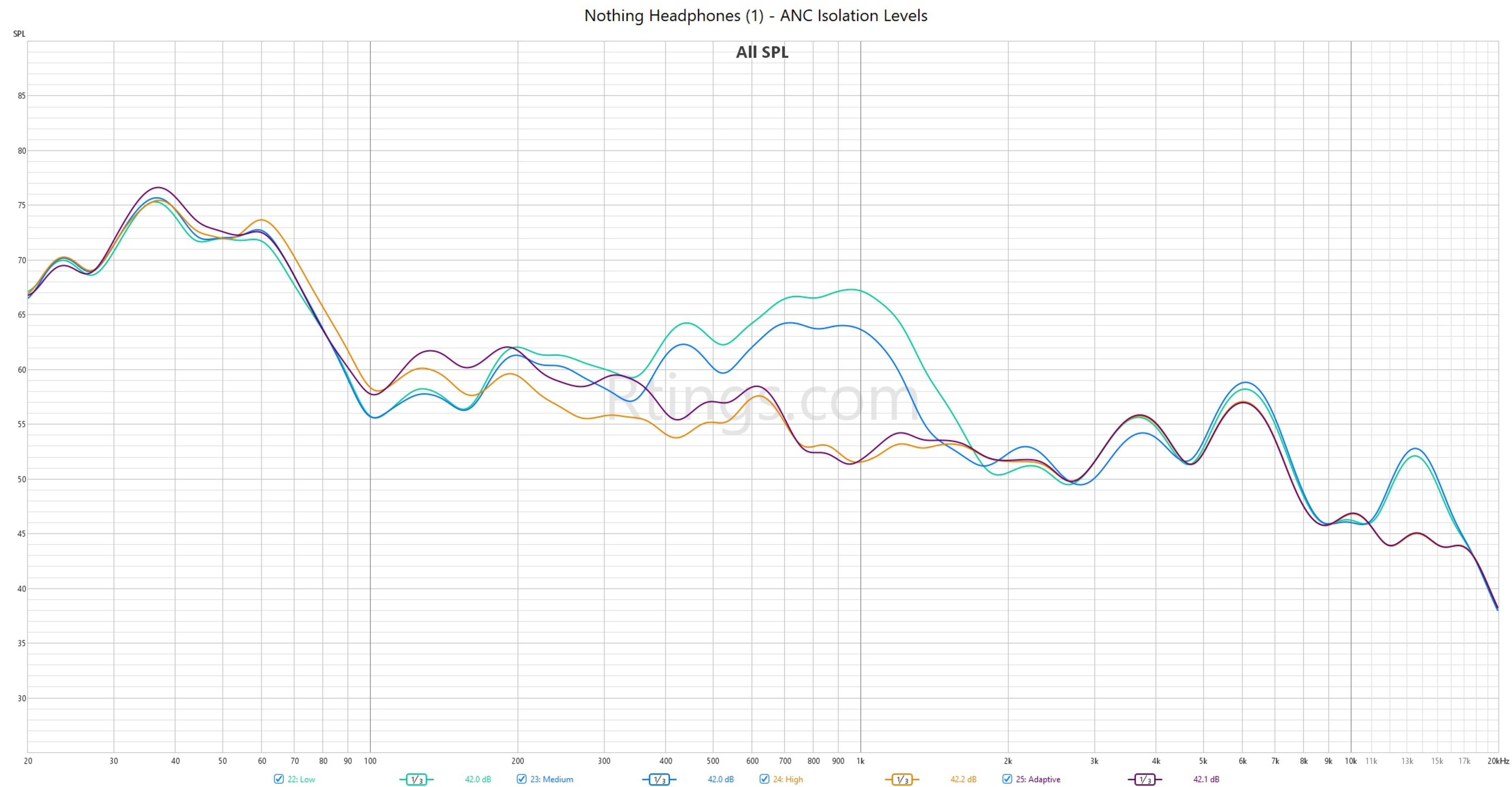 The Nothing Headphone (1) do a similarly amazing job when it comes to real-world performance. Again, they're poorest in the low-end, so don't expect these to block out the rumble of an airplane's engine, but higher-pitched sounds like chatty coworkers or pedestrians are effectively attenuated. It's worth noting that these headphones can be particularly sensitive to seal, which greatly impacts how well their noise isolation can perform. So it's worth taking the time to seat these securely on your head with each wear, but people who wear glasses may still hear more external noise than our tests show.