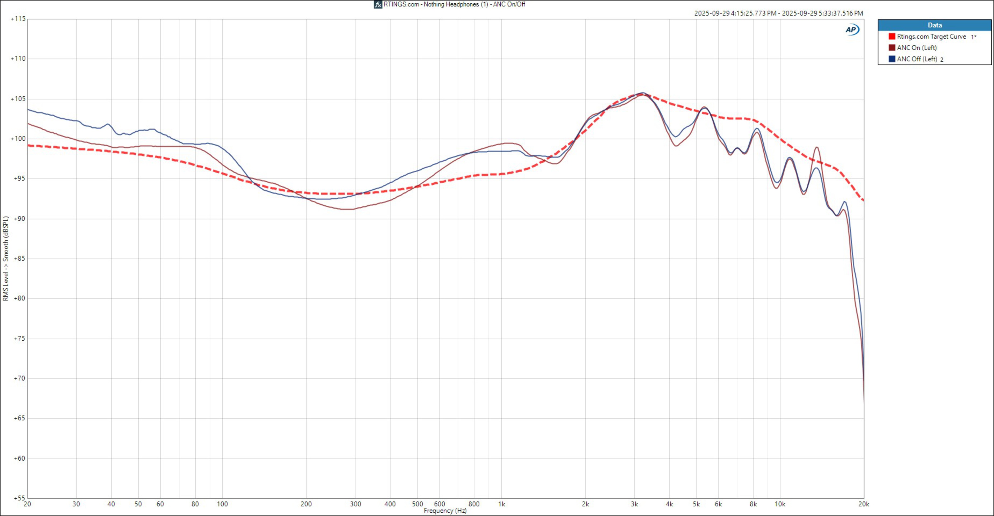 The Nothing Headphone (1) show poor frequency response consistency, mainly because of how much the bass response can drop when wearing glasses. Their shallow ear cups and soft foam pads make it hard to maintain a consistent seal, and for users who wear glasses, the fit around the frames often causes a noticeable loss in low-end response. If you have larger ears, you may also find the ear cups to be uncomfortably small.