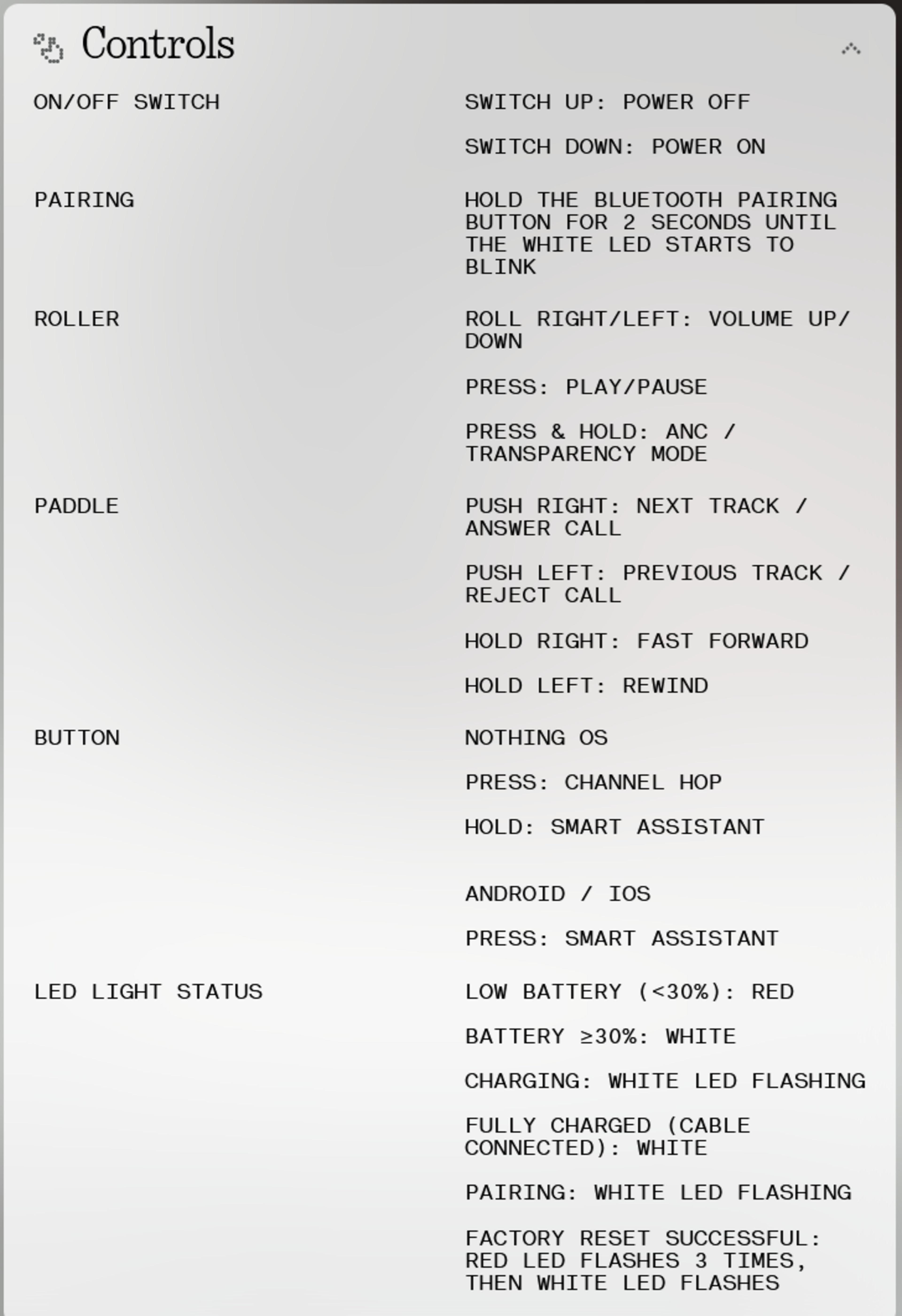 The Nothing Headphone (1) have good controls, though their unique layout and input methods may take a little getting used to. You can view the full list of controls. The buttons are well-spaced and easy to identify, and the paddle that lets you skip back and forward through tracks is easy to use. The roller is convenient for adjusting volume, but it can be tricky to make changes without jumps in volume, unless you use it very slowly and just click one at a time (you hear audio feedback for each volume notch). In terms of other audible feedback, you'll hear power-on and connection chimes, but there's no feedback for play/pause or skipping tracks, no warning at minimum/maximum volume, and no option for voice prompts. You also can't turn feedback sounds on or off in the app, so you're stuck with the default settings.