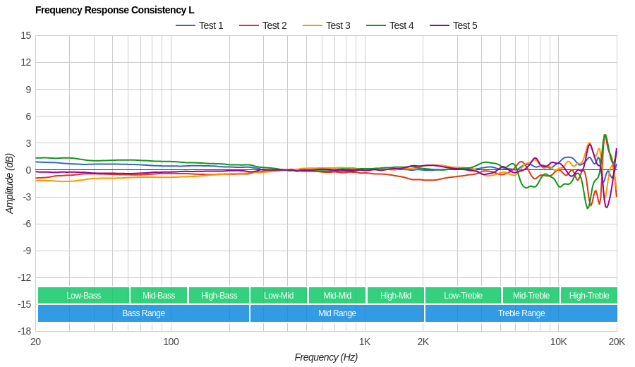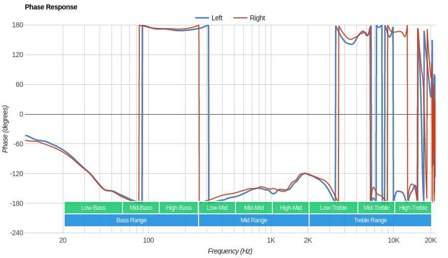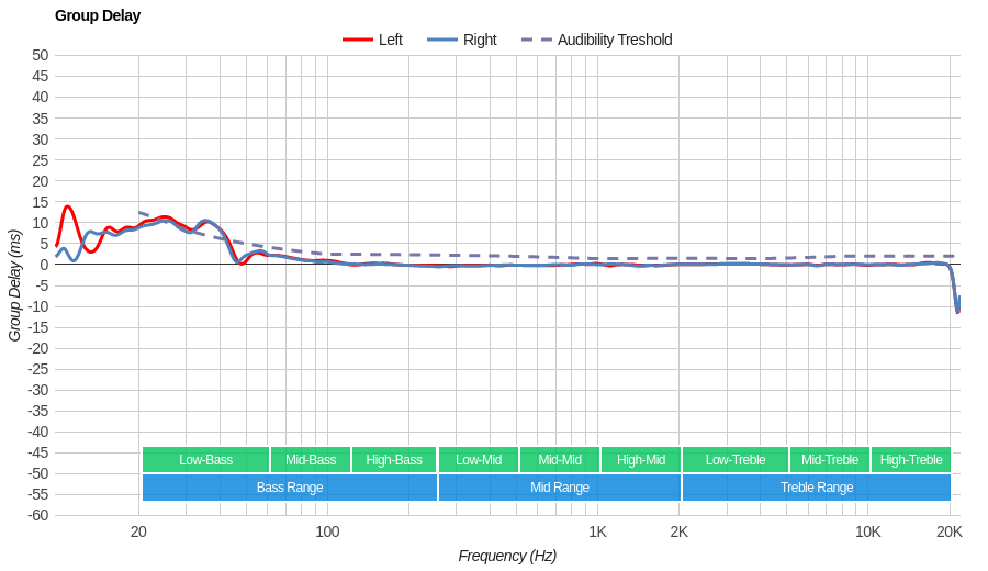 The stereo imaging is excellent. Except for a small peak in the low bass, the group delay response falls below the audibility threshold, resulting in a tight bass and a transparent treble reproduction. Additionally, the L/R drivers of our test unit are very well-matched. This is important for accurate placement and localization of objects (voices, instruments, video game effects) in the stereo image.