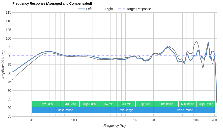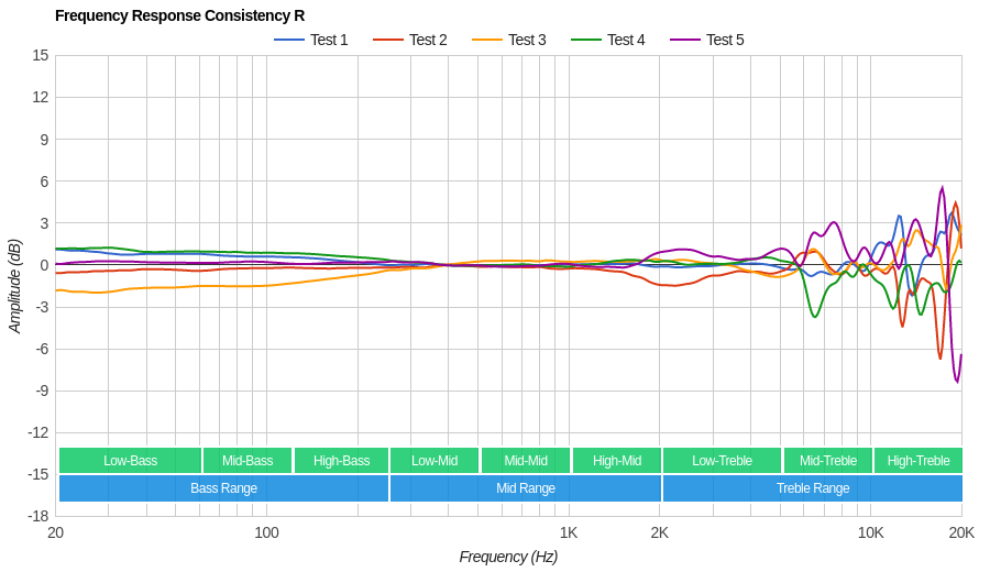 Their peaks and dips performance is good. There are several small peaks across the entire range. The low-bass brings thump and rumble, while the dip in the high-mid weakens vocals and lead instruments. The peak in low-treble makes the upper harmonics of vocals and lead instruments harsh, and sibilants such as S and Ts or cymbals sound dull in comparison.