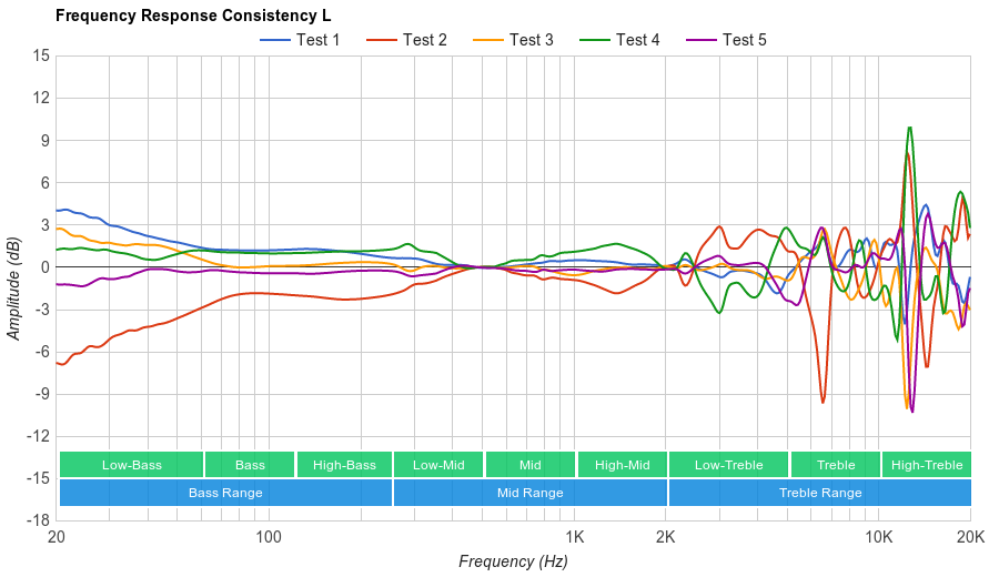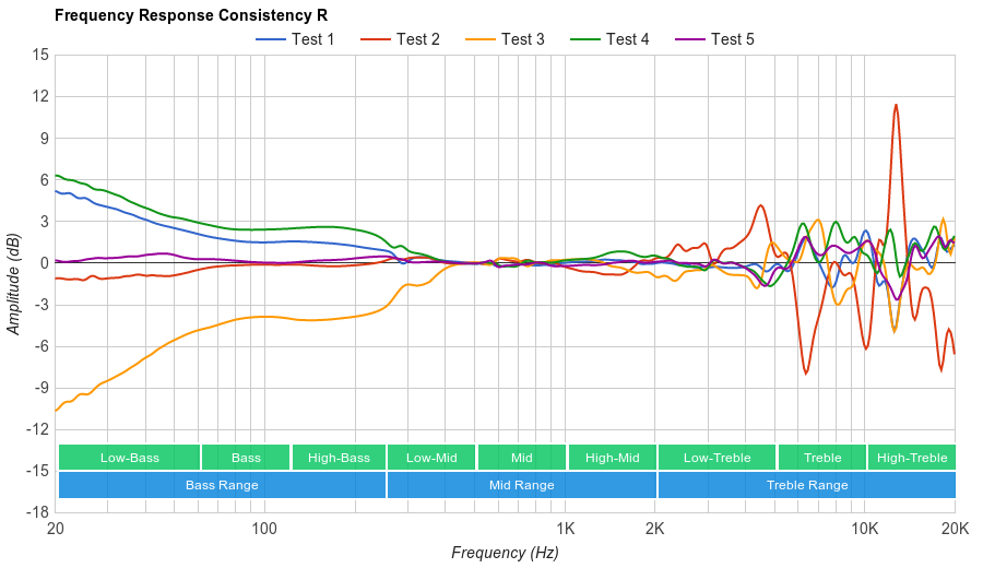 The Razer Kraken Pro V2 show poor consistency performance. In the bass range, they have quite an inconsistent delivery from person to person, with a maximum variance of 18dB at 20Hz. They also seem especially prone to a drop in bass if the user is wearing glasses that break the air-tight seal between the headphones and the ear. Their performance in the treble range is more consistent with the maximum deviation below 10KHz of about 12dB, but leaves some room for improvement.