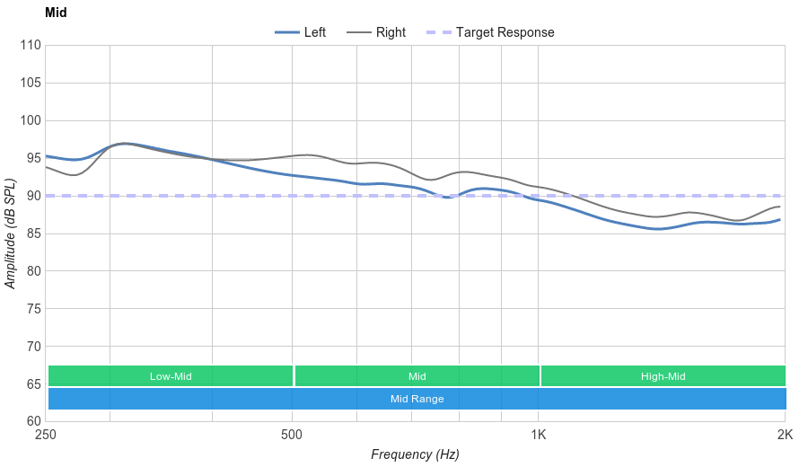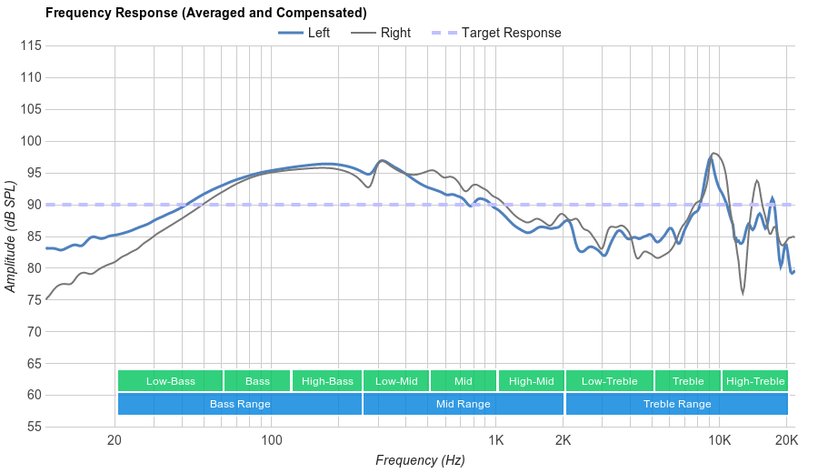 The bass range performance is decent. Low-frequency extension (LFE) is at 28Hz, which is great, but low-bass is lacking by about 2dB. This means that the bass is deep enough to produce thumps and rumbles, but it is slightly underemphasized. Additionally, mid-bass and high-bass are quite flat but overemphasized by about 5dB, which results in excess punch and boominess. Overall, their bass is deep and punchy, but boomy and overpowering. Also, their bass delivery varies significantly across users, and is sensitive to the quality of fit, seal, and whether you wear glasses. The response here represents the average bass response and your experience may vary.