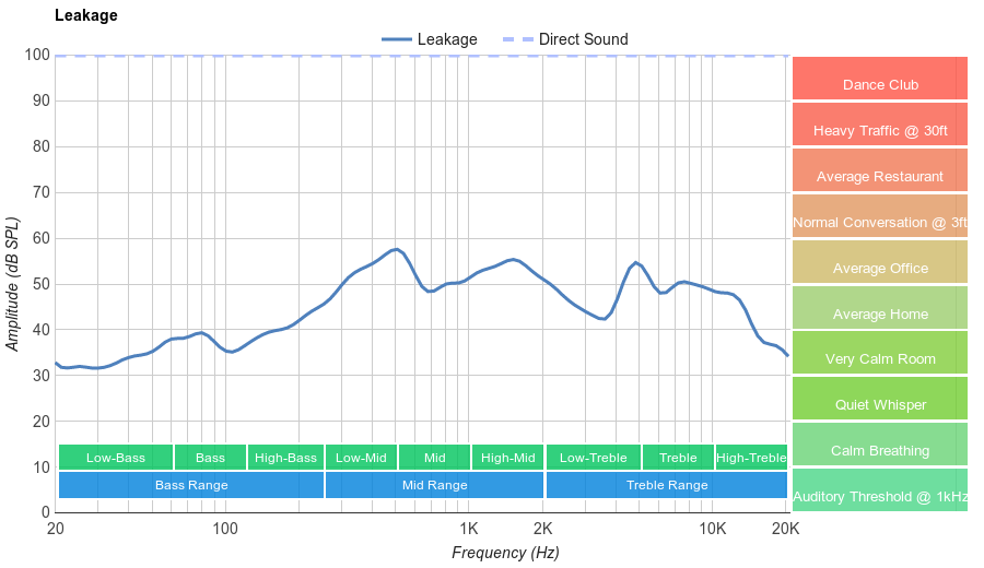 They have a sub-par leakage performance. The significant portion of leakage is spread from 300Hz to 10KHz, which is quite a broad range. However, the overall level of leakage is not very loud. This means that their leakage will sound fuller than that of in-ears and earbuds, but not as bright and loud as open-back headphones. Overall, their leakage will be audible to people around you at moderately to loud volumes.