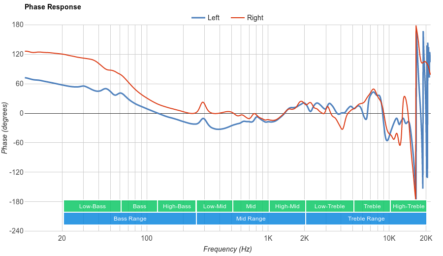 The imaging performance is good. Weighted group delay is 0.31, which is within good limits. The graph also shows that the group delay doesn't cross the audibility threshold except for a tiny bit in low-bass. This indicates a tight bass and transparent treble reproduction. In terms of driver matching, the L/R drivers of our test unit were decently matched in amplitude and frequency response. However, they show a significant mismatch in phase both in the bass range and high-treble. The will have a negative effect on the coherency of the stereo image, but shouldn't have a big negative effect on placement and localization of objects like voice and footsteps.