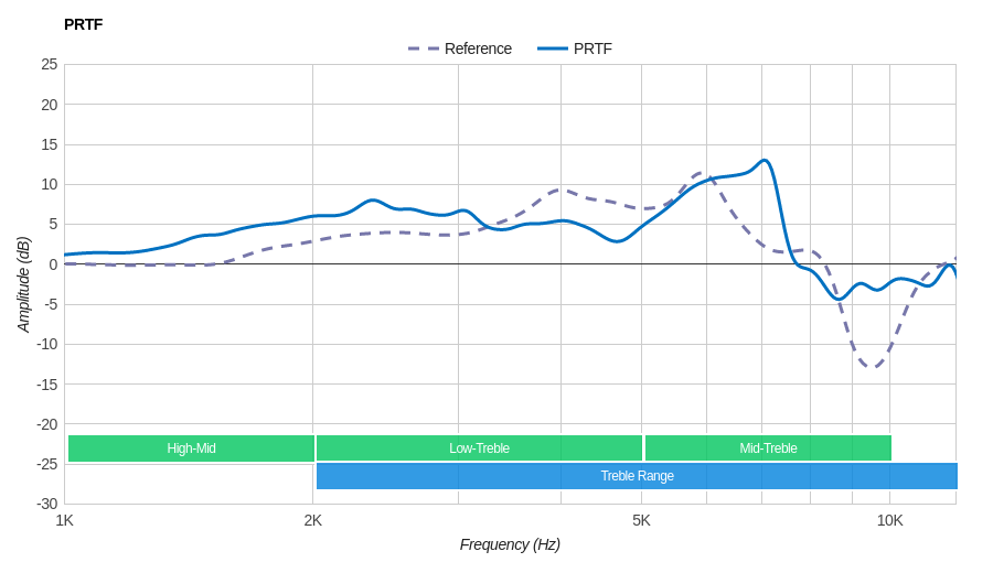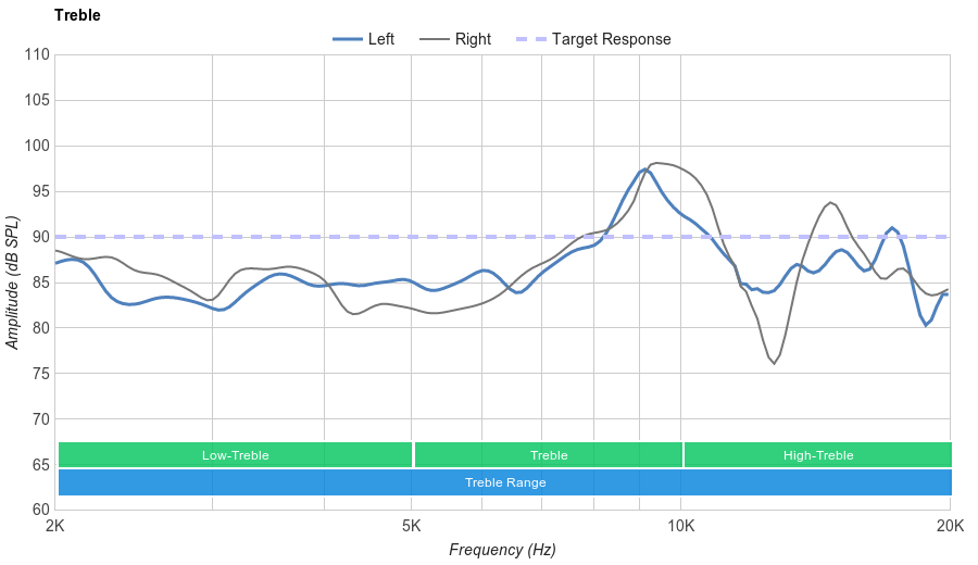 The treble is mediocre. Low-treble, and mid-treble, up to 7KHz, are flat but also underemphasized by about 5dB. This has a negative effect on the detail and presence of vocals and other lead instruments. The peak around 9KHz could makes S and T sounds (sibilances) sharp-sounding on overly bright tracks. Overall, the treble lacks brightness, especially considering the hyped bass of these headphones.