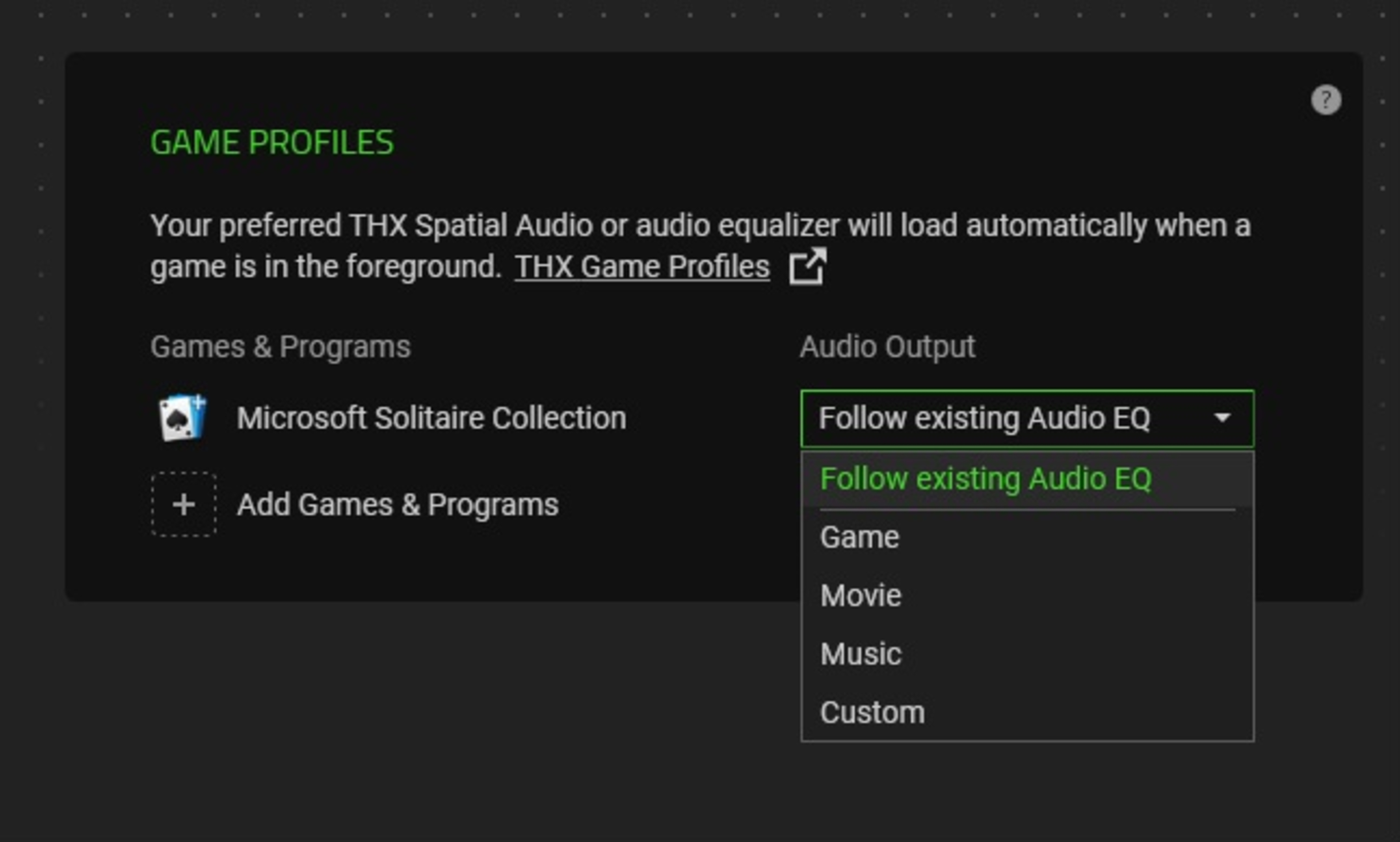 The Razer Kraken V3 Pro are compatible with THX virtual surround. There are a few modes that you can select: 'Game Mode', 'Movie Mode', 'Music Mode', and 'Custom Mode'. Each mode changes the speaker modeling set up to better suit that genre of audio. You can also calibrate each mode to your liking, select which app uses which mode, or let the program automatically select itself.