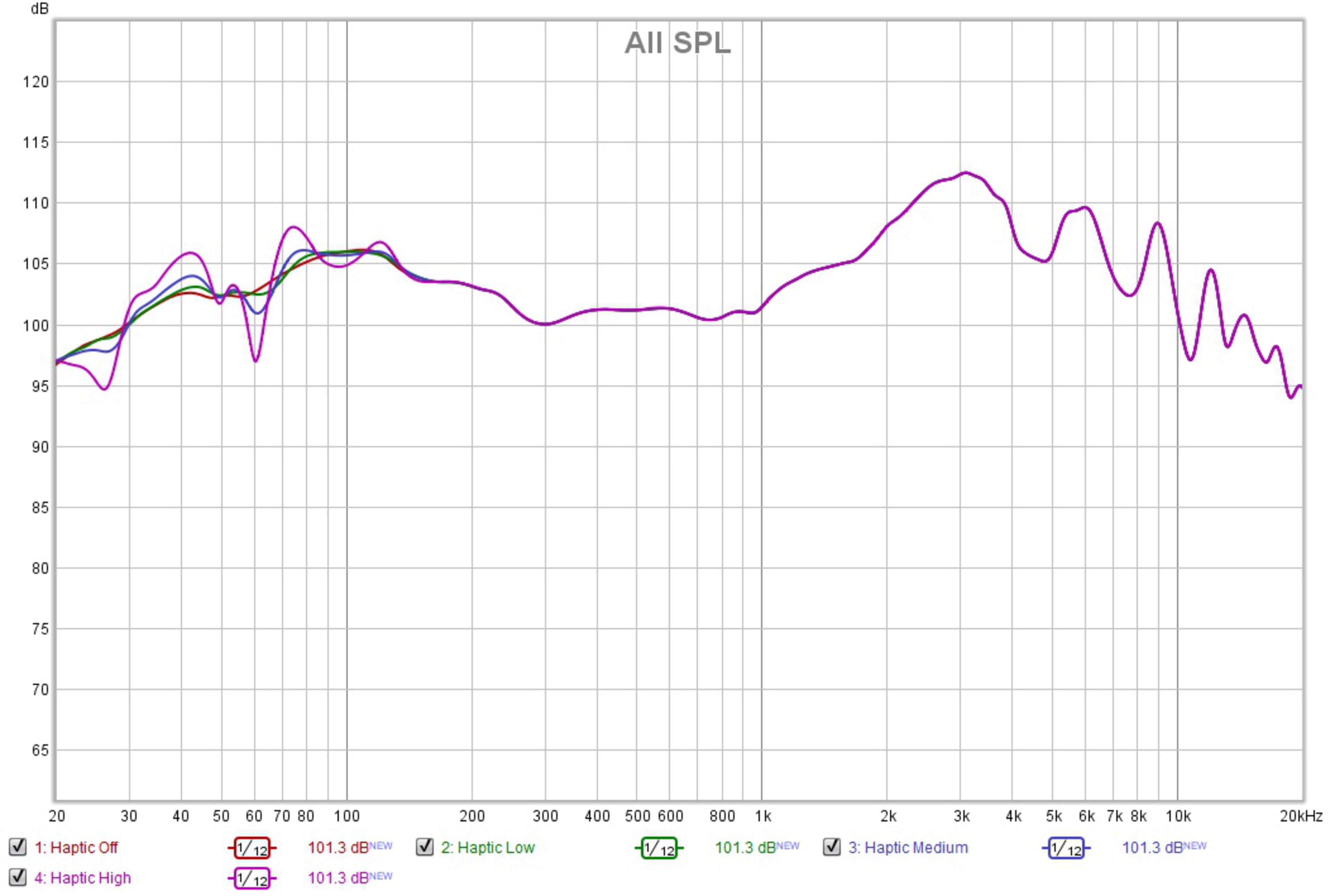 When the haptic bass feature is at 'Low', the Razer Kraken V3 Pro have a more excited sound profile than the Razer Kraken V3 HyperSense. They still have a bump in bass that adds extra boom to mixes, which can help emphasize sound effects like footsteps. Their treble response is a lot more neutral, and while it's still a bit overemphasized, dialogue and instruments sound clear and bright. If you're looking for more bass, their haptic bass feature can add more rumble and boom when set to 'High'. You can see a comparison of their raw frequency response with the different levels of haptic bass here. You can also cycle through the different levels by pressing the HyperSense button or via the app. However, there isn't much difference between the 'Low' and 'Medium' settings.
