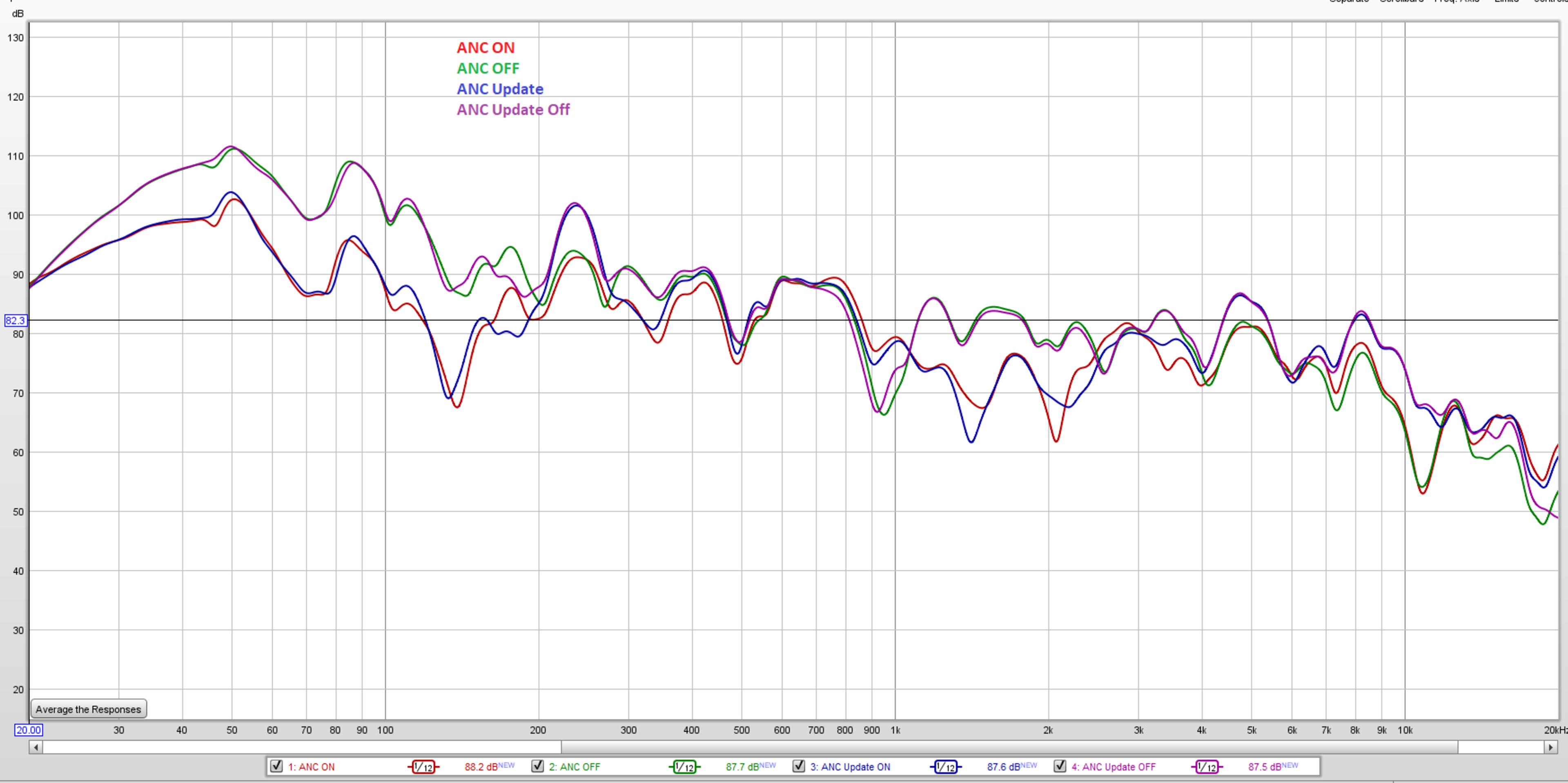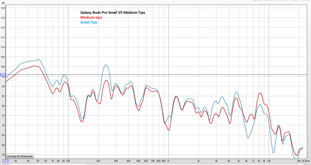 We have also tested these headphones using firmware update R190XXU0AUA5. However, there wasn't a significant change in the ANC's overall performance. You can see the graph of our measurements with both the previous firmware and the new firmware here. Although our original results used small ear tips, there has been user discussion that noise isolation performance may differ depending on the size of ear tips used. We've run some passes using the medium ear tips, and you can see a comparison of both performances here. However, the small and medium ear tips deliver a similar noise isolation performance.
