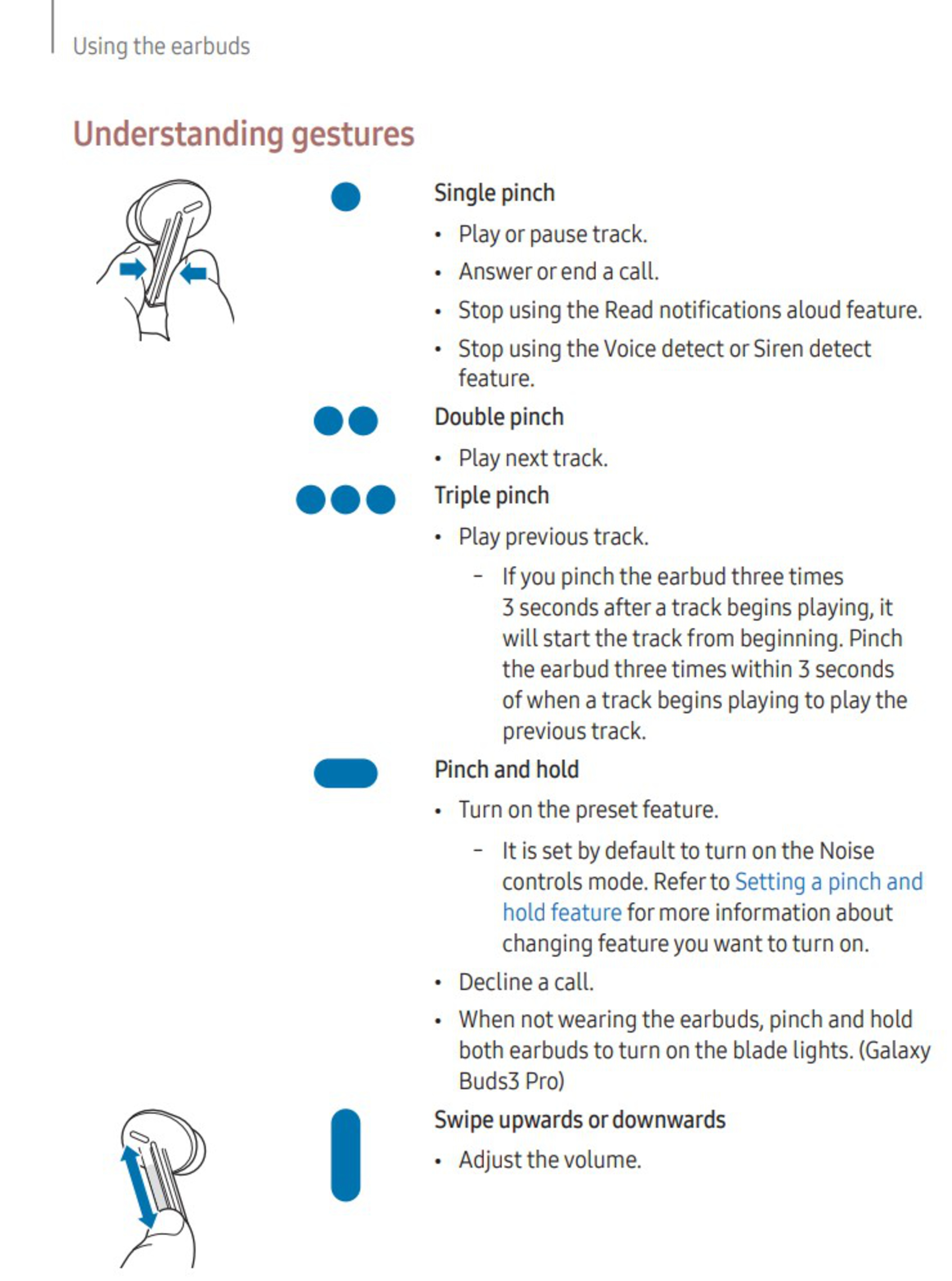 If you're logged into a Google account on the device the buds are connected to, you can use voice commands to control functions such as play and skip. Finally, if you use a compatible Samsung Galaxy device (Galaxy S22 and Galaxy Flip 4 or newer) to connect to the buds, you get access to a real-time AI translator, but we were unable to test this feature, as it relies on the connected device. Here is an image of the buds' control scheme.