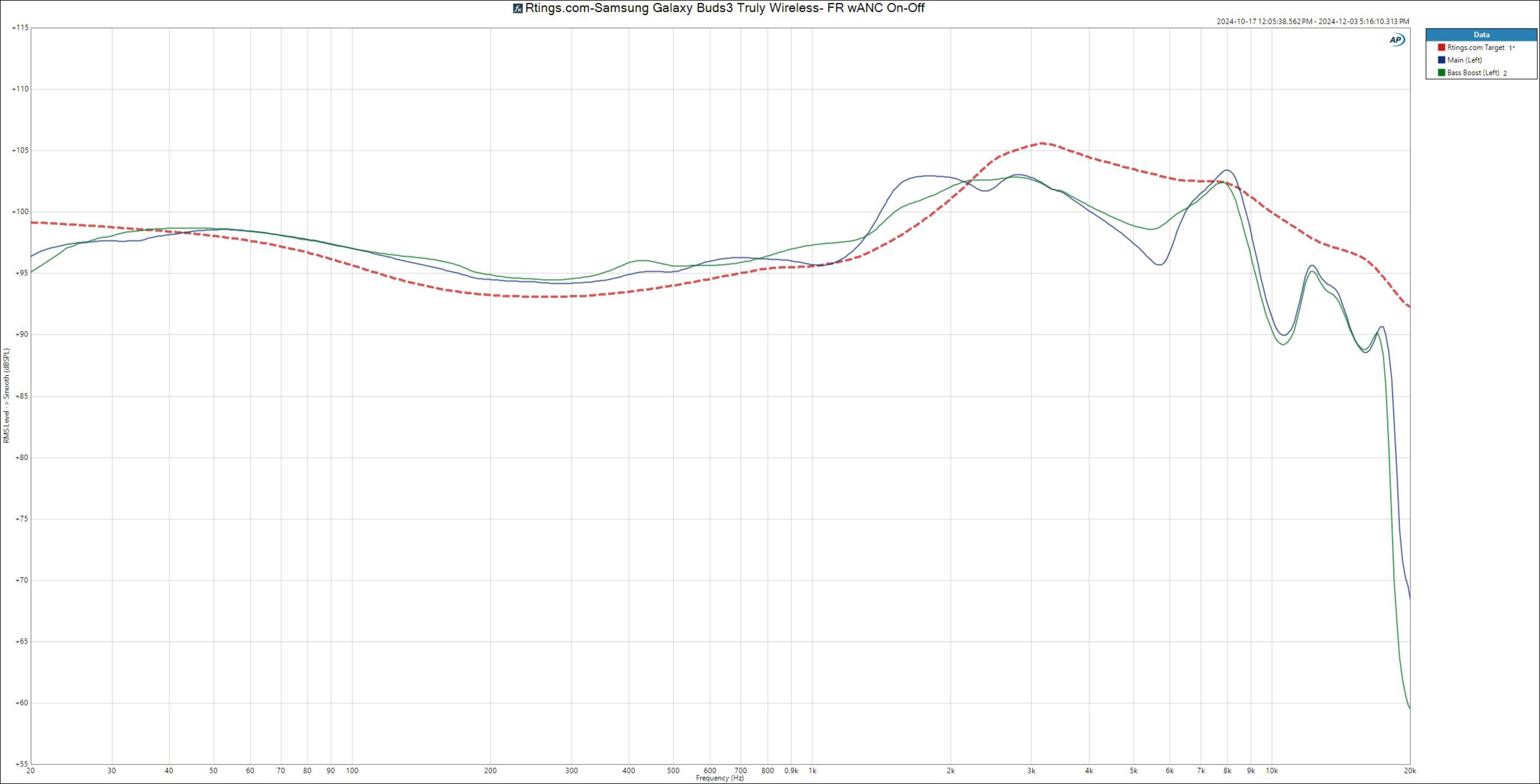 The Samsung Galaxy Buds 3 have only passable frequency response consistency. Generating consistent sound from wear to wear with earbud-style headphones is often harder than with silicone-tipped designs like the Samsung Galaxy Buds2 Truly Wireless because the buds don't create a seal with the ear, making it more likely their positioning shifts slightly between and during wears. But as long as you take the time to achieve a fit that feels comfortable to you, the sound won't shift too much between wears.