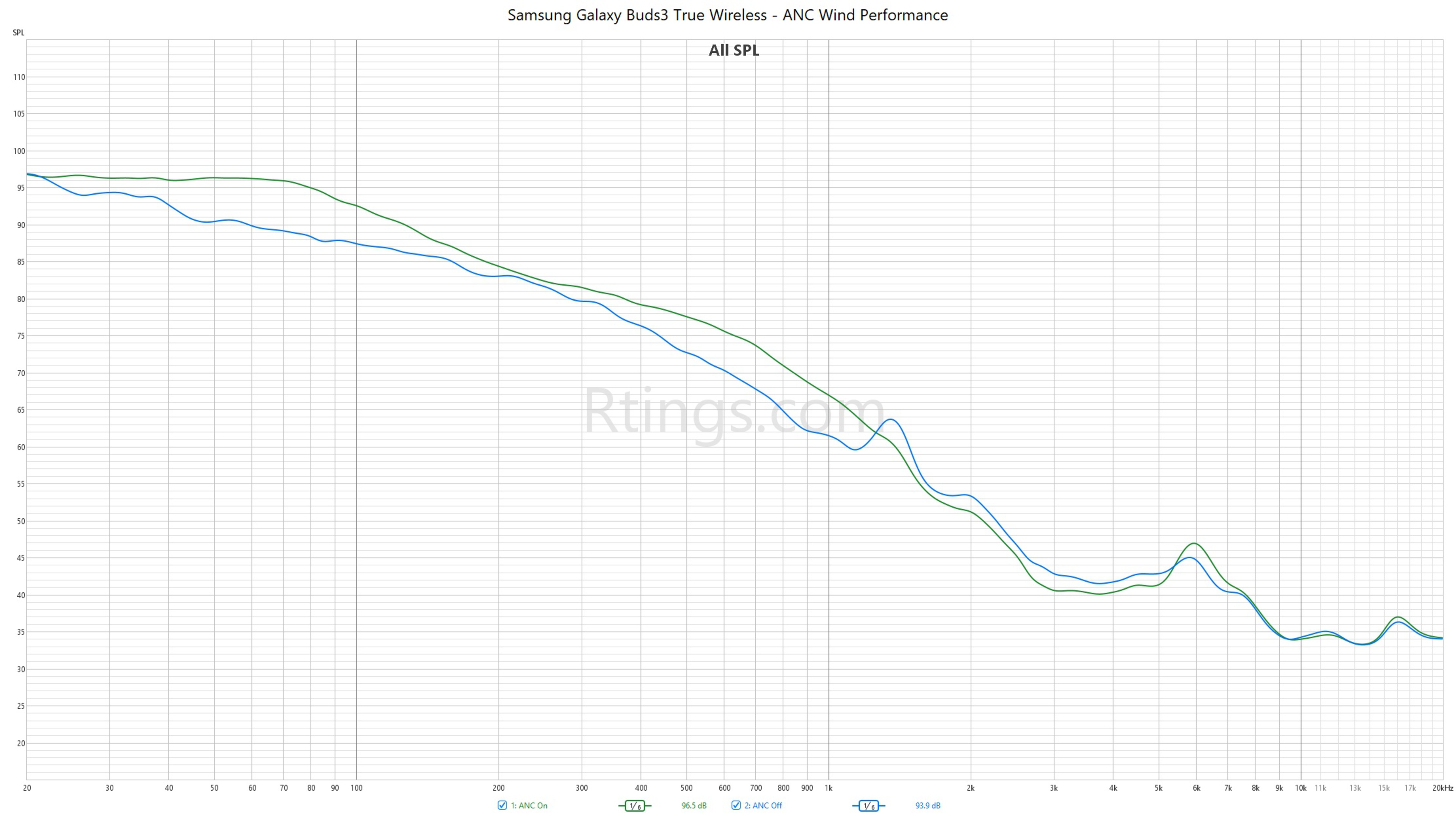 The Samsung Buds 3 have poor full-range noise isolation. Even with ANC turned on, the buds hardly reduce the low rumble of train engines at all, though they do reduce mid-range sounds like office chatter. Most of the buds' isolation in the treble region is produced passively by them blocking your ear canal, as ANC doesn't have much impact in this range. Still, they do reduce AC whine a little. That said, many people like earbud-style designs because they don't block the ear canal, allowing you to better hear your surroundings. The small peak above zero in the low-bass is only produced when using our testing rig, and we don't expect you to encounter this.