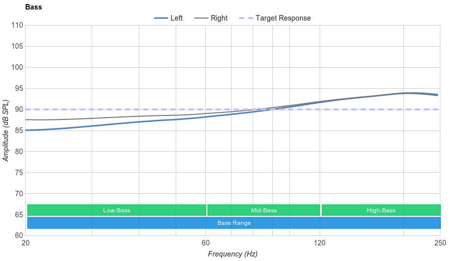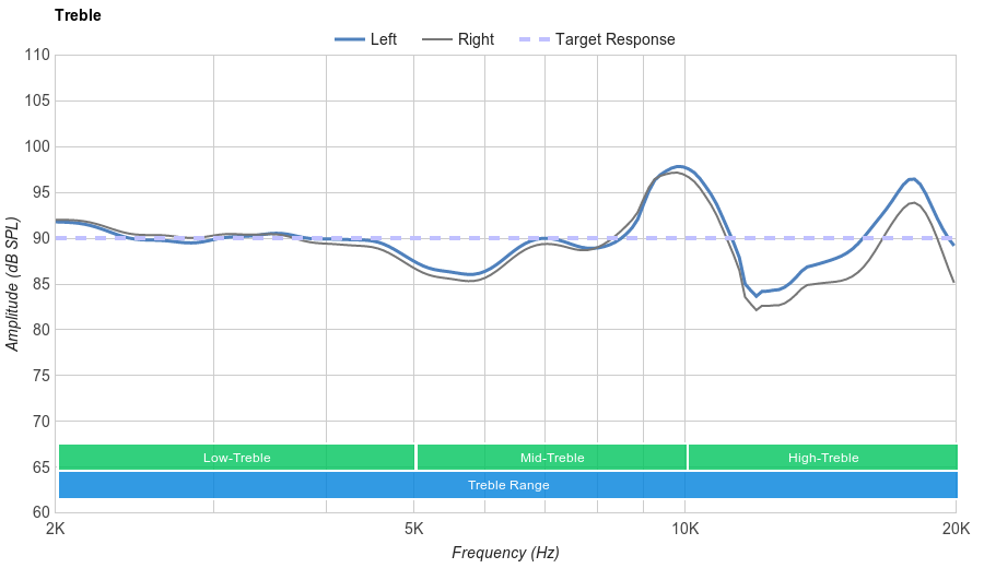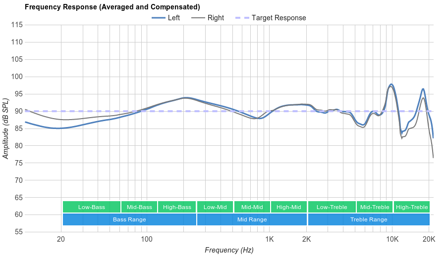 The Samsung Gear IconX have excellent mid accuracy. The response is even and well-balanced, but the small dip centered around 700Hz gives bass instruments more emphasis and nudges vocals and lead instruments to the back of the mix.
