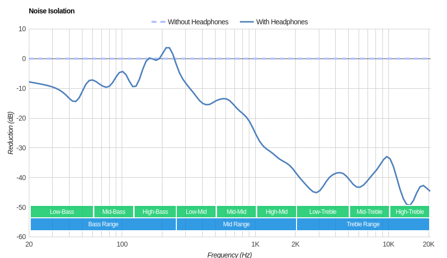 The Samsung IconX have an good noise isolation performance. In the bass range, occupied by the rumble of airplane and bus engines, they reduce the noise by about 7dB, which is poor However, this is rather impressive for in-ears and more than what most active noise cancelling headphones can achieve (like the Sony WF-SP700N Truly Wireless). In the mid-range, important for blocking speech, they get 20dB of isolation which is outstanding. In the treble range, occupied by sharp S and T sounds, they achieved more than 41dB of isolation, which is fantastic.