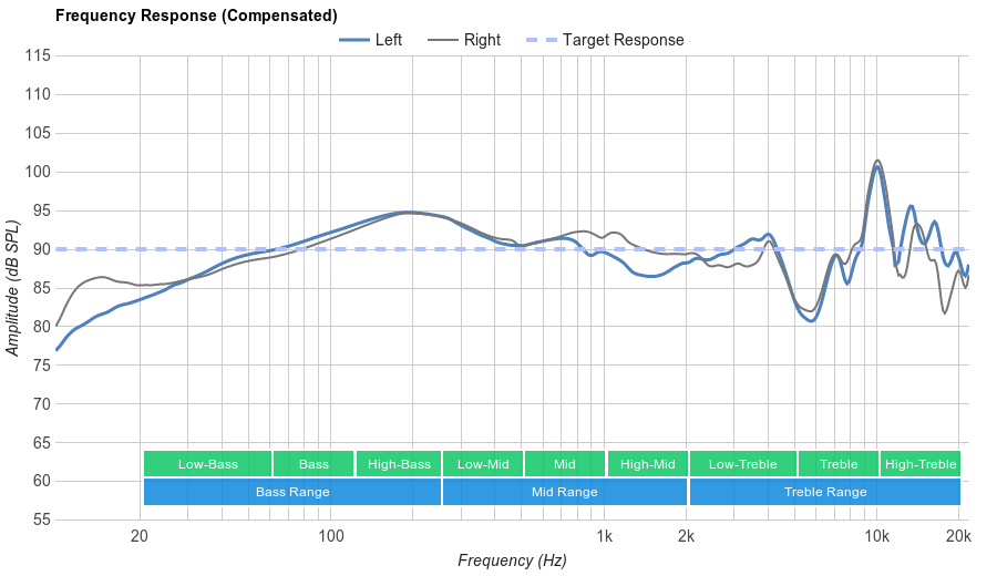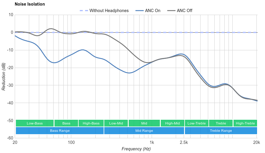 Decent noise cancelling, especially considering these are advertised as on-ears (even though the cups are a little larger than most on-ears). Low-end isolation is not the best we have tested, but still good. There also seem to be a weak point around 2KHz, which actually could be useful if one wants to be able to have a conversation with ANC On.