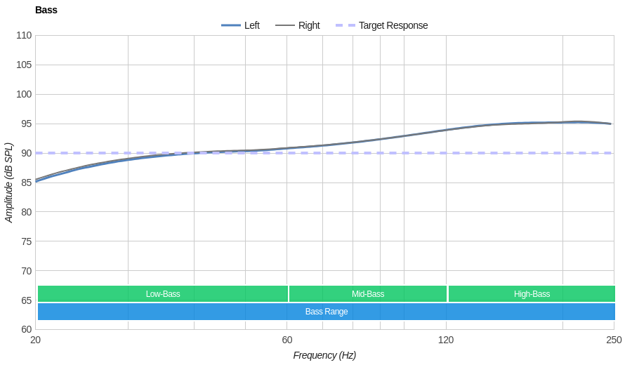 The bass is very good. Their LFE (low-frequency extension) is at 24Hz, which is great. Low bass, responsible for the thump and rumble common to bass-heavy genres, is within 1dB of our neutral target. However, mid-bass, which is responsible for punch, and high-bass, which is responsible for warmth, are overemphasized by 2dB and 5dB, respectively. This makes the overall bass deep but noticeably boomy.