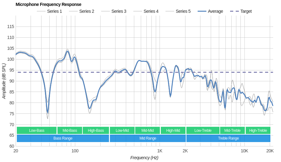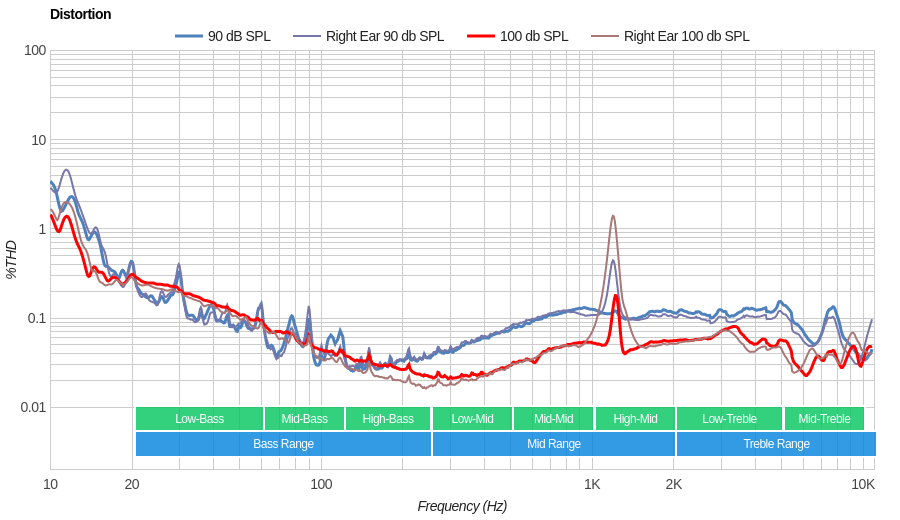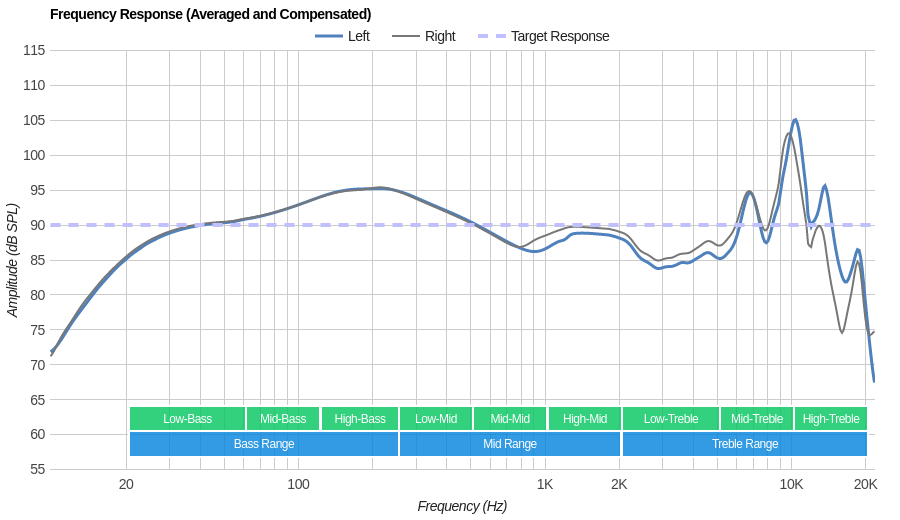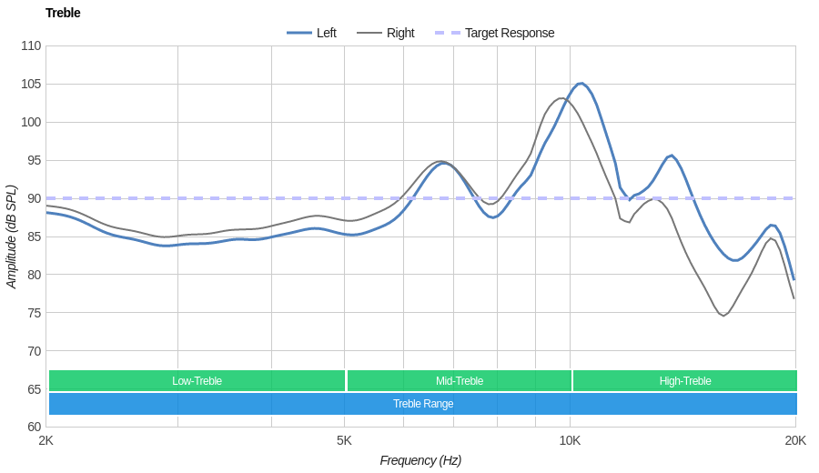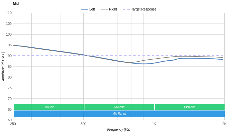 The mid-range performance is very good. The overemphasis in low-mid is actually the continuation of the high-bass overemphasis. This thickens the vocals a bit and makes the overall mix a little cluttered and muddy. Conversely, mid-mid and high-mid are under our target by about 1.5dB, which nudges vocals and lead instruments toward the back of the mix by giving more emphasis to the lower frequencies.