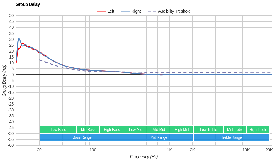 The imaging performance is great. The weighted group delay is at 0.66, which is above average. The GD graph also shows that the group delay response crosses the audibility threshold in the bass range, but not by much. So, although, in theory, this results in a slightly loose and late bass, it'll be so subtle that most users won't notice it. Additionally, the L/R drivers of our test unit were very well-matched. This is important for accurately locating and placing objects (voices, instruments, video game effects) in the stereo image.