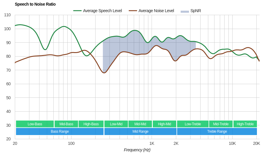 The Sennheiser AMBEO's binaural microphone's speech recording quality is above average. The bumps in the bass range indicate that these microphones are prone to pops and rumbling noises, and the dip around 150Hz means that speech recorded with these mics could sound a bit thin. The roll-off in the treble range means that speech recorded with these mics will lack a bit of brightness and airiness, but it will still be easily understandable. This is because speech intelligibility is mostly dependent on the 500Hz-4KHz range.