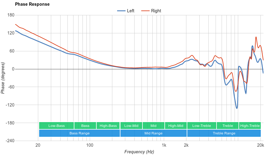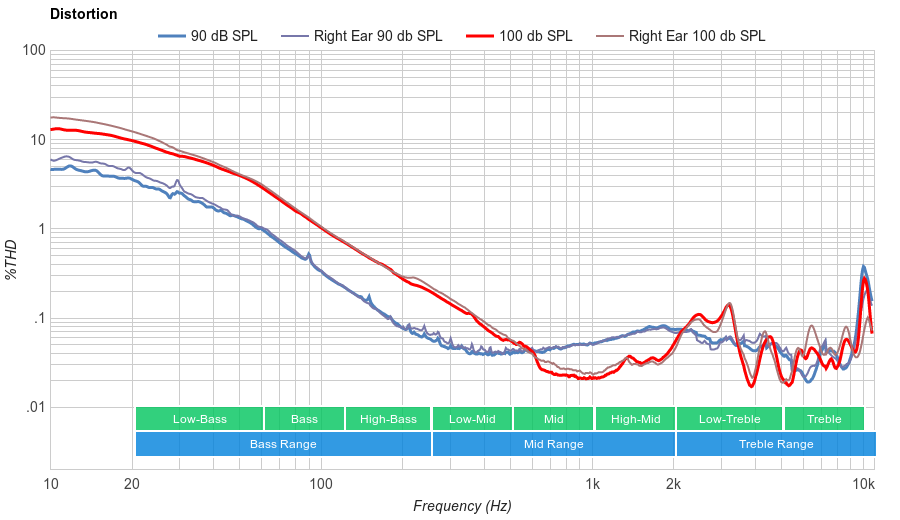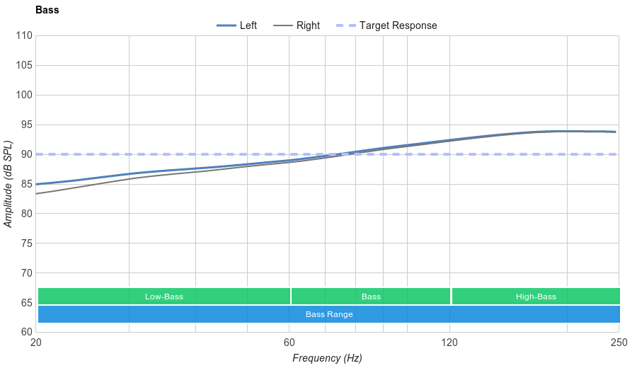 Very good Bass Range performance. Low-bass, is a bit lacking and the high-bass is slightly overemphasized by an average of 4dB. This makes the sound of these headphones noticeably boomy and lacking a little low-end thump and rumble.