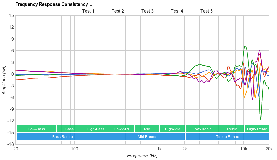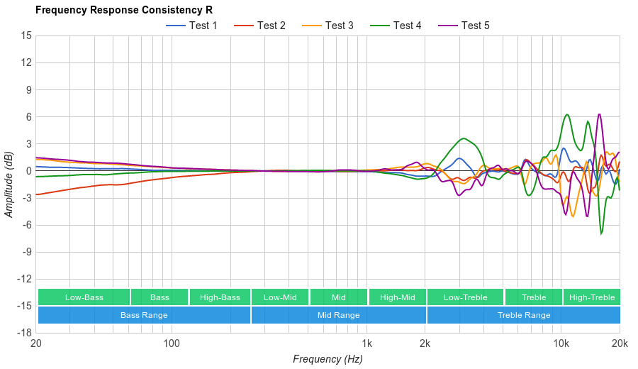 Excellent consistency. The Bass Range of our Over-Ear and On-Ear headphones are measured on 5 different human subjects, 5 times each. The HD 700 shows a consistent response in the mid-range but a bit of variation with their bass. However, since they're open-back, the design allows them to rely less on an air-tight seal to create their low-end. The Treble Range also shows good consistency, but depending on the positioning, there could be up to 3dB of variance at 3KHz.