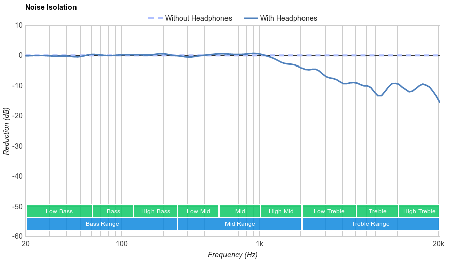 Weak Noise Isolation. These are open-back headphones and not meant to isolate, so they barely achieve any reduction up to 2KHz. Above that, they only achieve about 10dB of isolation, which is also poor.