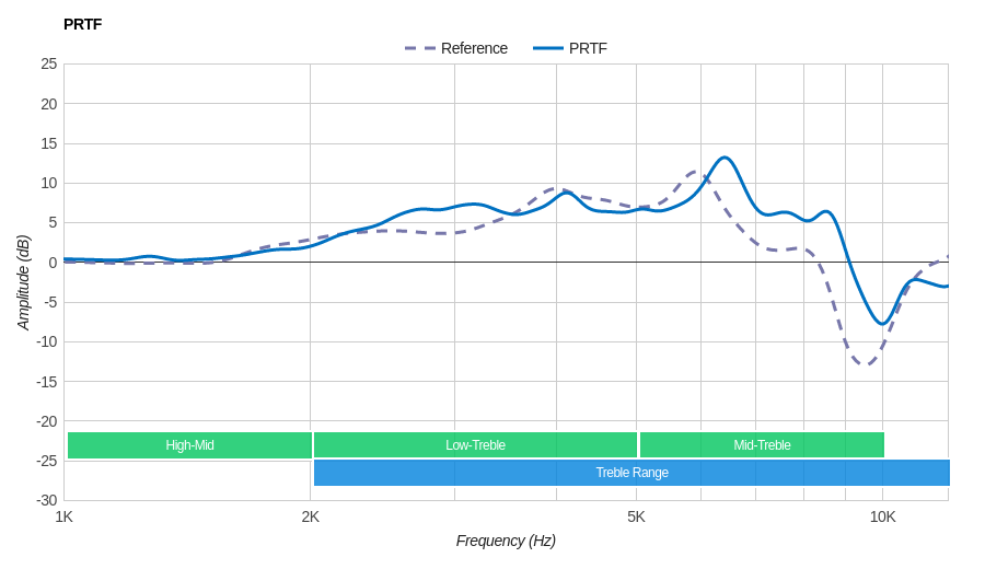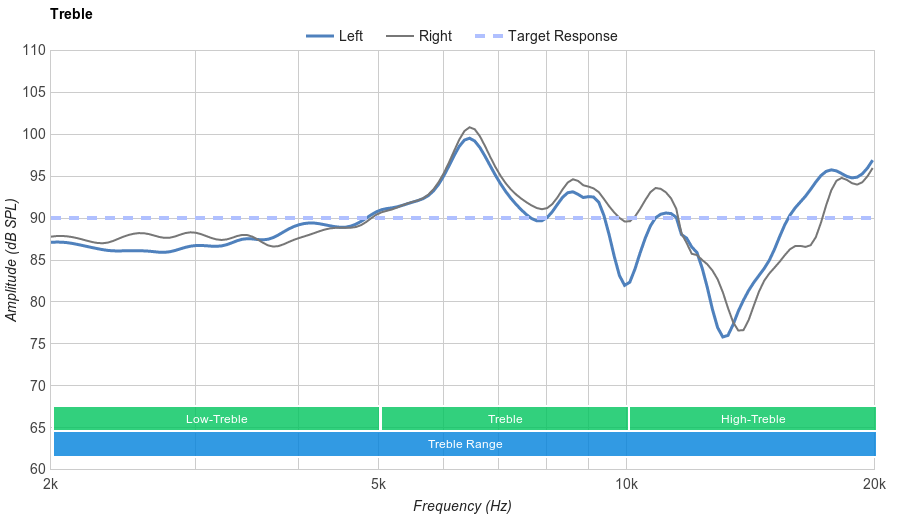 Great Treble Range performance. Low-treble is reproduced consistently and is within 1dB of our target. However, the sharp peak around 6.5KHz could make treble sound piercing and sharp on certain track.
