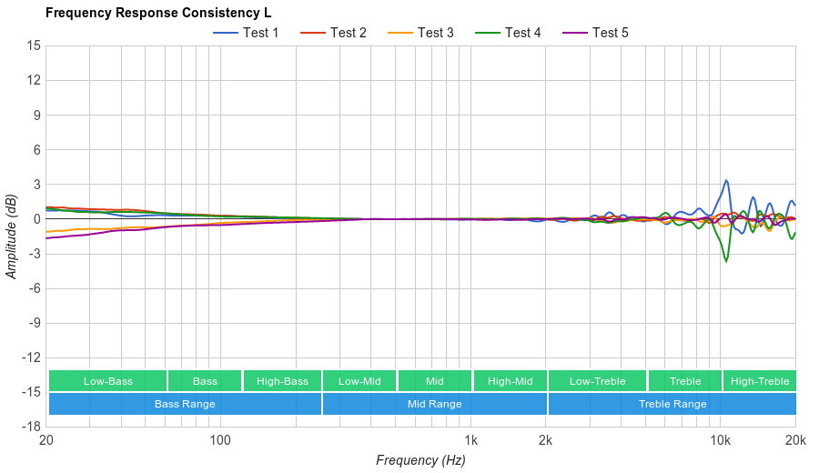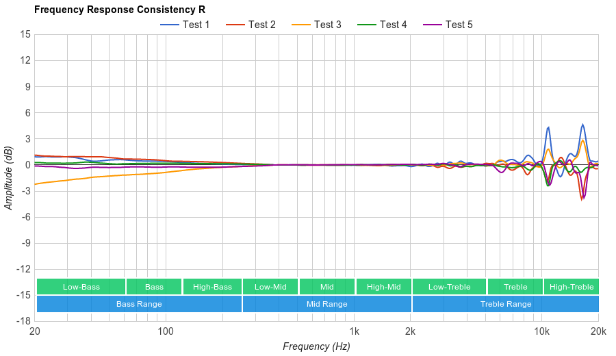 The frequency response consistency of these cans is impressive. While there are slight deviations in low-bass and high-mids, which can happen if you wear glasses or have thick hair, the rest of the range is very consistent. Once you achieve a good fit, you'll have consistent audio delivery. They're quite large, so you'll want to watch for gaps around your jaw, for example, if you have a smaller head.