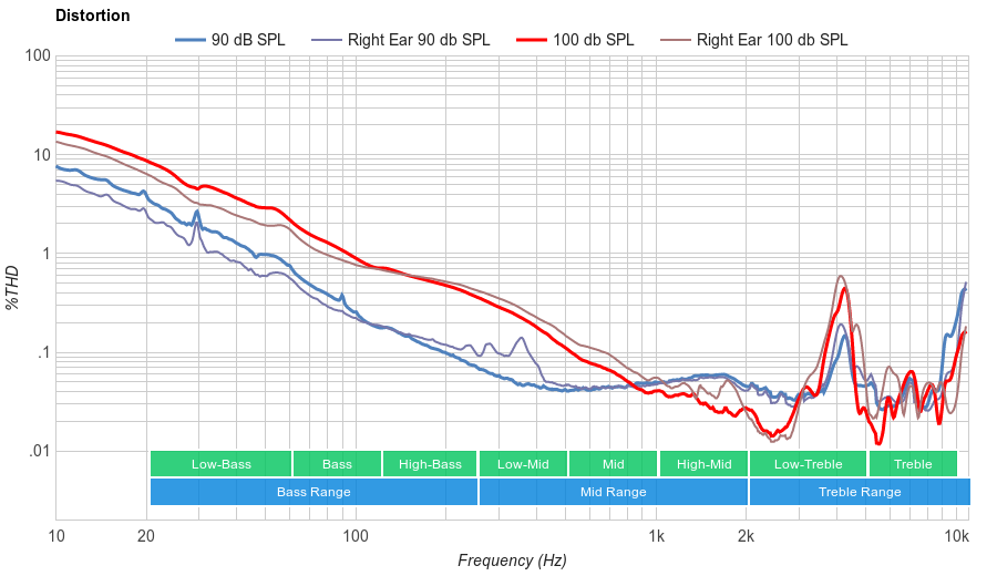 Their treble target compliance is superb. The low-treble is quite flat but slightly underemphasized. As a result, vocals and instruments are a bit veiled, though because of their flat sound profile, they're not overwhelmed by other frequencies. Sibilants like the harmonics from cymbals still sound bright without coming across as shrill, given their slight exaggeration in the mid-treble.