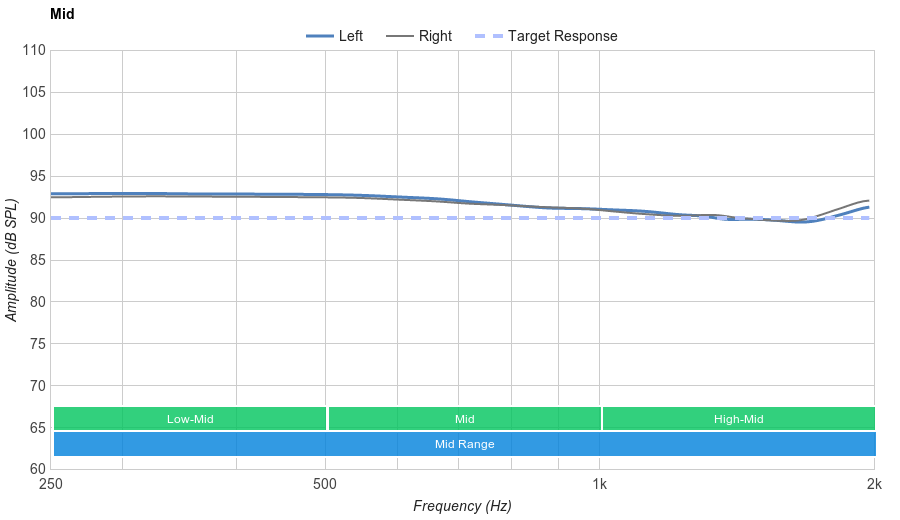 The mid-range target compliance of these headphones is outstanding. The response throughout the range is very even and flat, resulting in natural-sounding vocals and lead instruments. However, a minor dip in the high-mid slightly weakens these sounds. In songs like Arabesques No. 1 by Claude Debussy, the piano keys sound smooth and present towards the beginning of the piece. Yet, as the music ascends into a higher register, the notes become a touch more mellow and gentle.