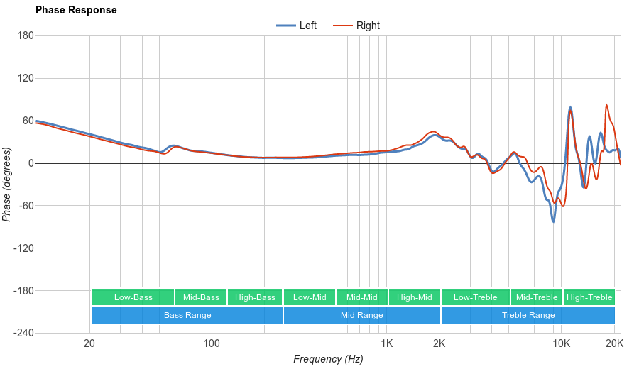 The headphones have impressive stereo mismatch performance. Their weighted amplitude is well-matched, as is the weighted phase mismatch, overall, besides a spike at the upper threshold of hearing. There's a small mismatch in the weighted frequency response, which tilts the stereo image very slightly to the right driver in the highest frequencies. That said, this can vary with different units, so yours may perform differently.