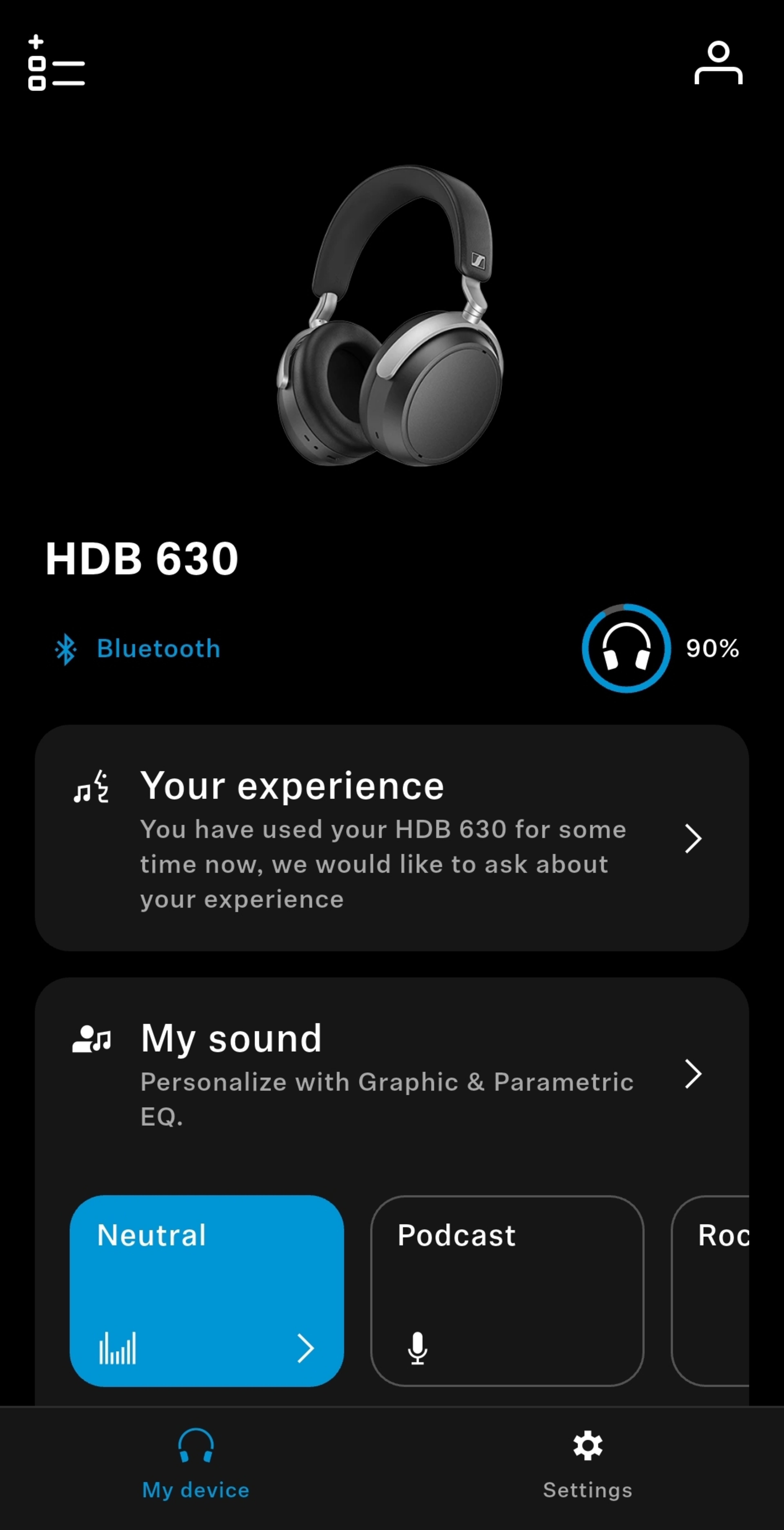 The Sennheiser HDB 630 have a balanced default sound. Their slightly emphasized bass adds just a touch of thump and punch to kick drums, ensuring they feel immersive and full. The mid-range is virtually flat, so voices sound accurate and true-to-life. The treble is also balanced, with a slight roll-off in the upper frequencies, ensuring sounds like hi-hats don't become too piercing. You can customize the default sound via the parametric EQ in the App or the EQ presets.