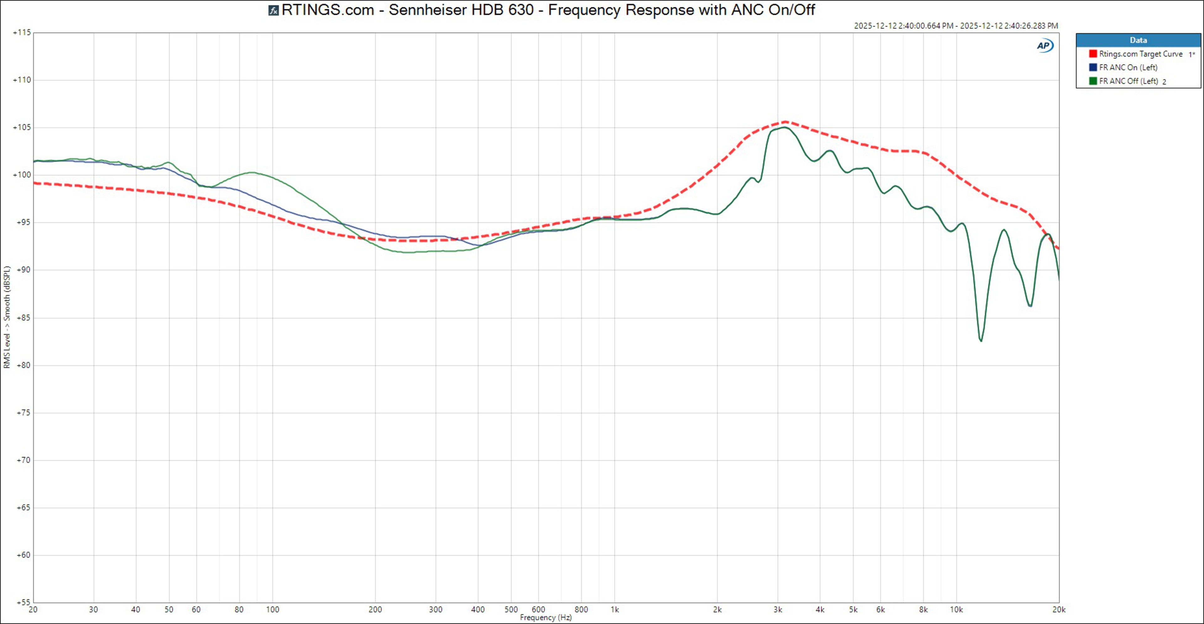 The Sennheiser HDB 630 have impressive peaks and dips performance, meaning they don't deviate much from their balanced sound. The bass and mid-ranges are flat. The treble is a little more uneven. While the peaks and dips in this range are still fairly modest, they're enough that sounds like sibilants may sound a touch dull or piercing depending on their pitch.