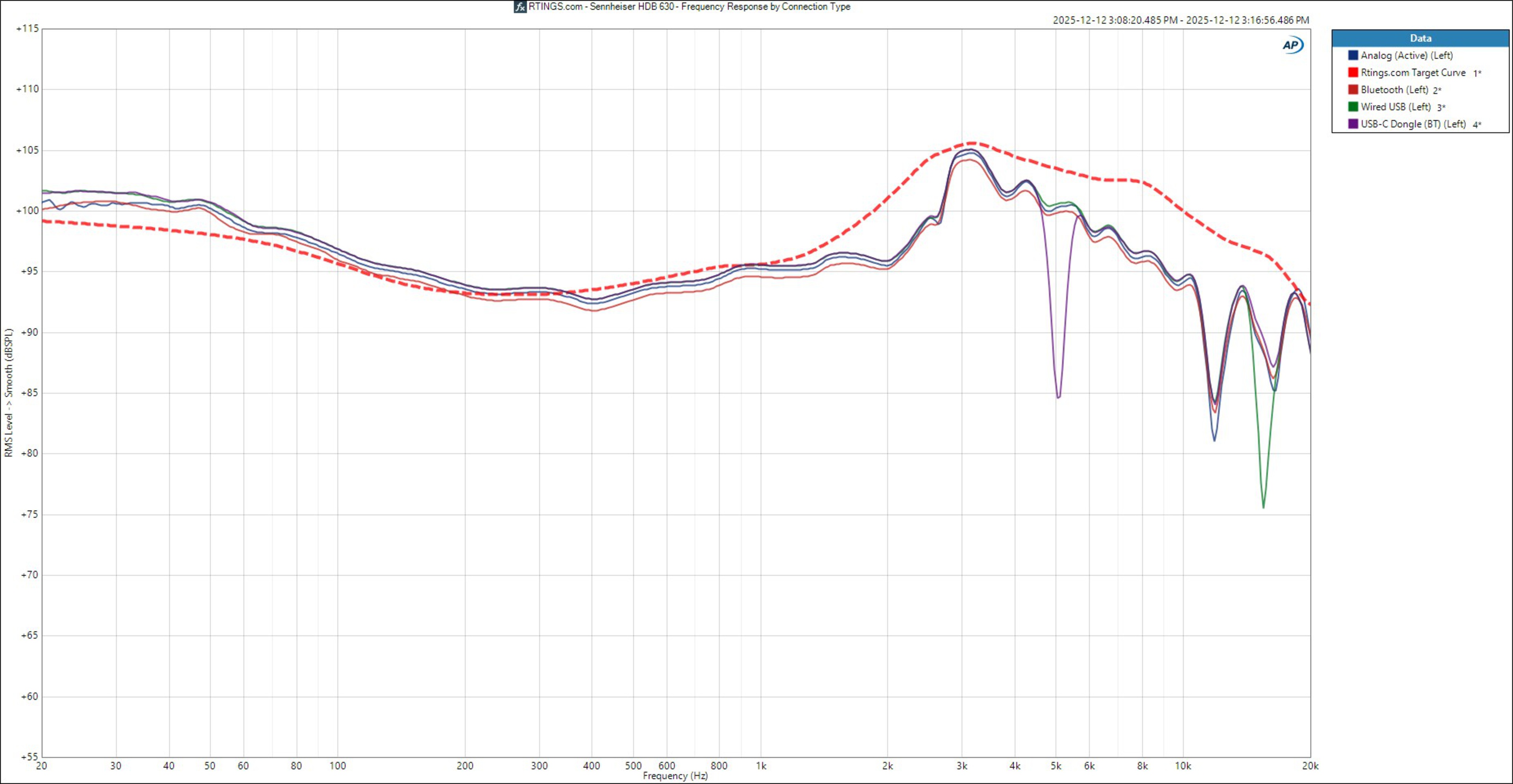 The Sennheiser HDB 630 have outstanding compliance with our target in the mid-range. The entire region is virtually flat, so instruments and vocals alike sound clear, present, and detailed.