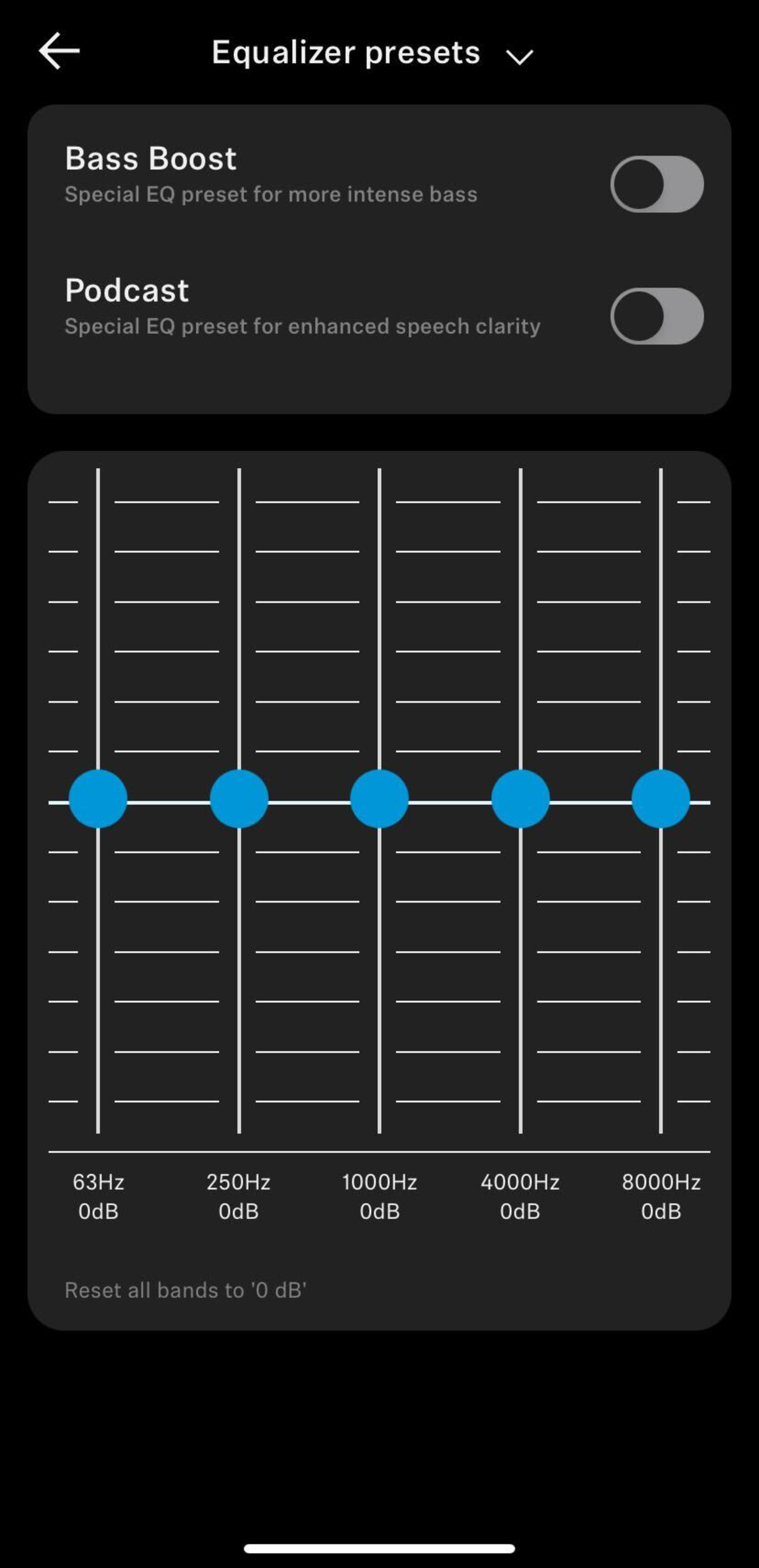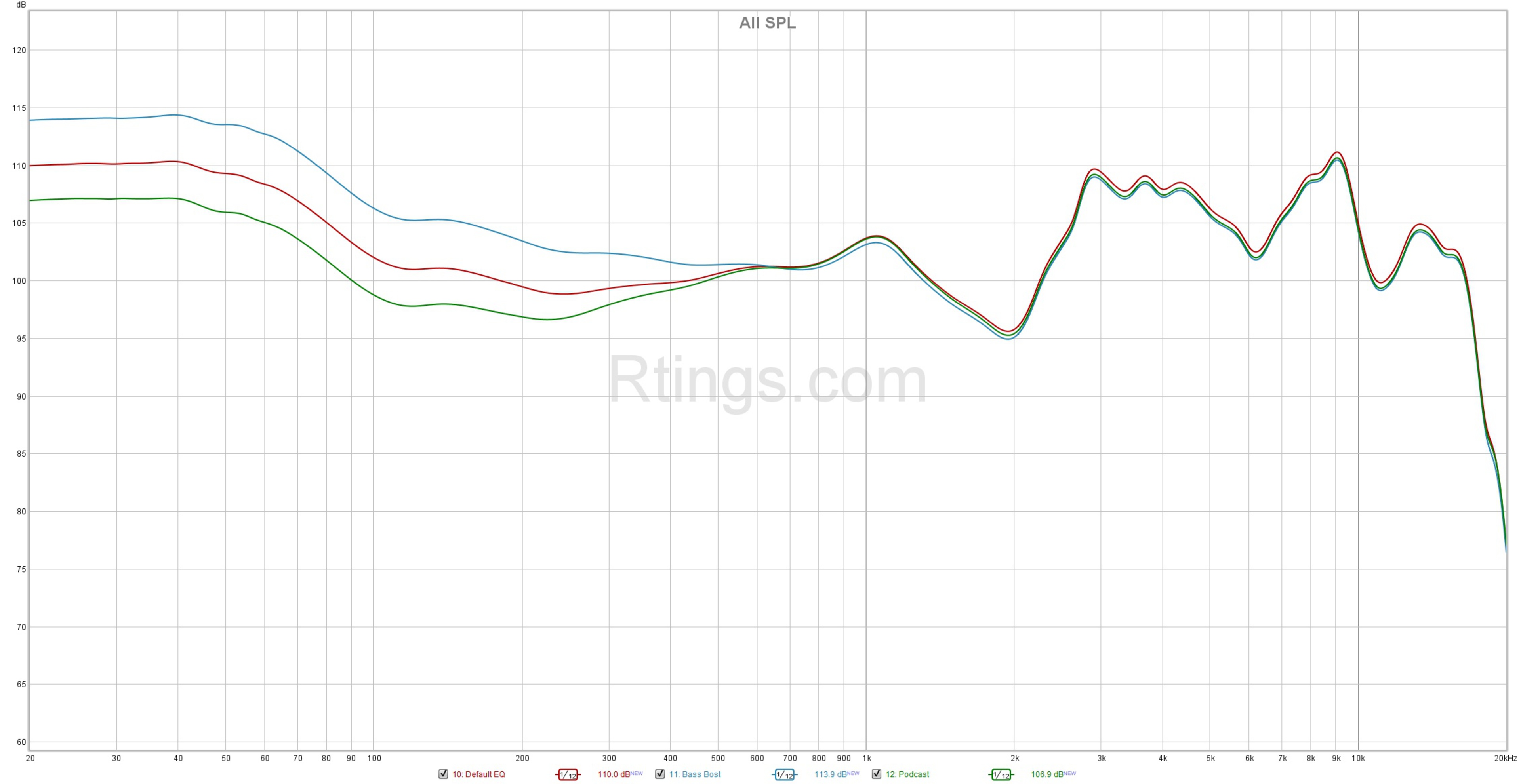 You can view a comparison of the 'Bass Boost', 'Podcast', and default modes, which you can also enable at the same time as any other custom EQ setting in the app. Amusingly, 'Podcast' mode is still rather bassy, though it hollows out the lower mids, while 'Bass Boost' unsurprisingly ups the low-end considerably. Still, these EQ presets mainly alter the bass and lower mid-range.