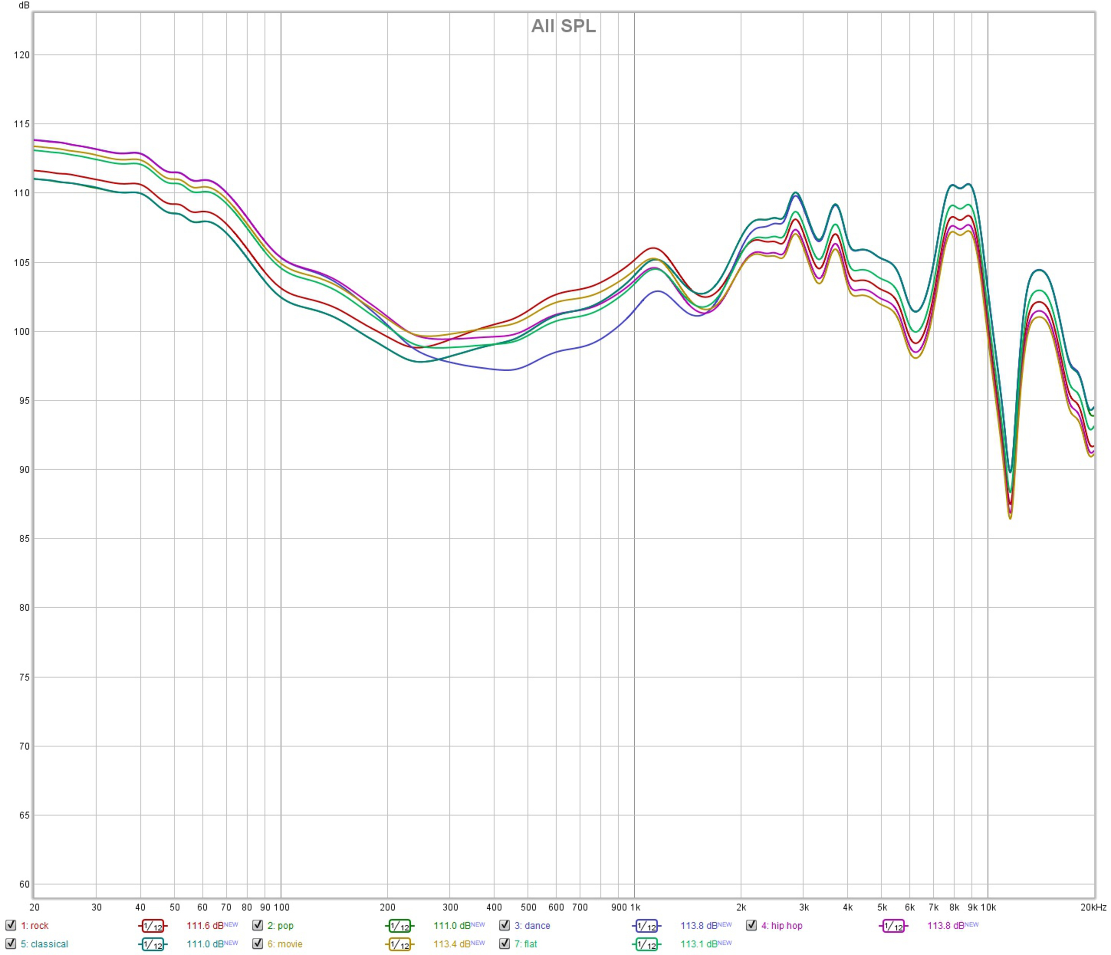 These headphones have superb harmonic distortion performance. Each frequency tested at 94 and 104 dB/SPL remains free of unwanted artifacts, and the headphones produce a clean signal.