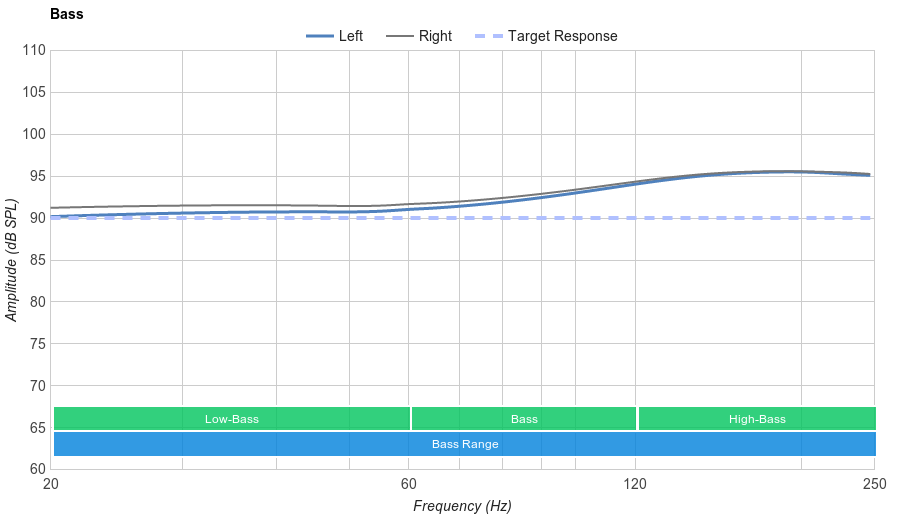 The Sennheiser Momentum In-Ear have a very good bass. LFE (low-frequency extension) is at 10Hz, which is excellent. Low-bass, responsible for the thump and rumble common to bass-heavy music at within 1dB of our neutral target, meaning they produce just the right amount of sub-bass. However, mid-bass, responsible for the body of bass guitars and the punch of kick drums is hyped by 2.5dB. Also, high-bass, responsible for warmth is overemphasized by more than 5dB, which makes the overall sound of these headphones rather boomy and muddy.