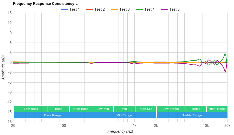 The frequency response consistency of the Sennheiser HD1 In-Ear is excellent. Assuming the user is able to achieve a proper fit and an air-tight seal using the assortment of tips that come with the headphones, they should be able to get consistent bass and treble delivery every time they use the headphones.