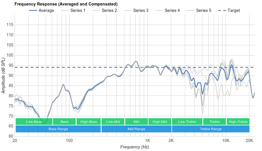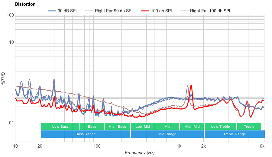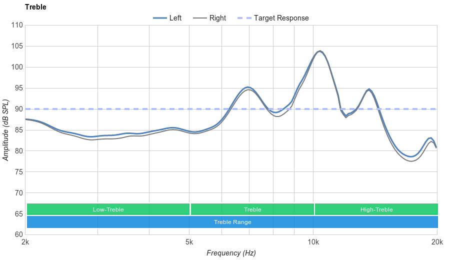 The treble range performance is mediocre. The broad 5dB dip in low-treble negatively affects the detail and presence of vocals and lead instruments. On the other hand, the peaks at 7KHz and 10KHz make the vocals and cymbals a bit sibilant. That is, sharp and piercing on S and T sounds.