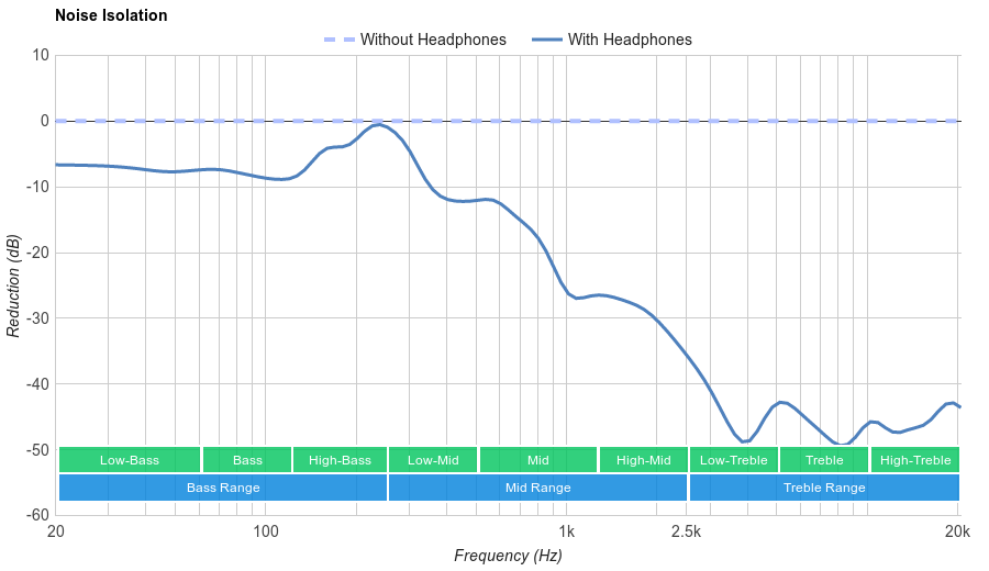 Decent isolation. Although these in-ears isolate only passively, their tight fit creates an impressive degree of isolation for a passive device. In the bass range, where the rumble of airplane and bus engines sits, they isolate by about 6dB, which is inadequate. The weak point with these headphones seem to the 200Hz range. However, in the mid-range, important for blocking out speech, they achieved more than 19dB of isolation, which is quite good. In the treble range, occupied by sharp sounds like S and Ts, they isolate by more than 45dB, which is excellent.