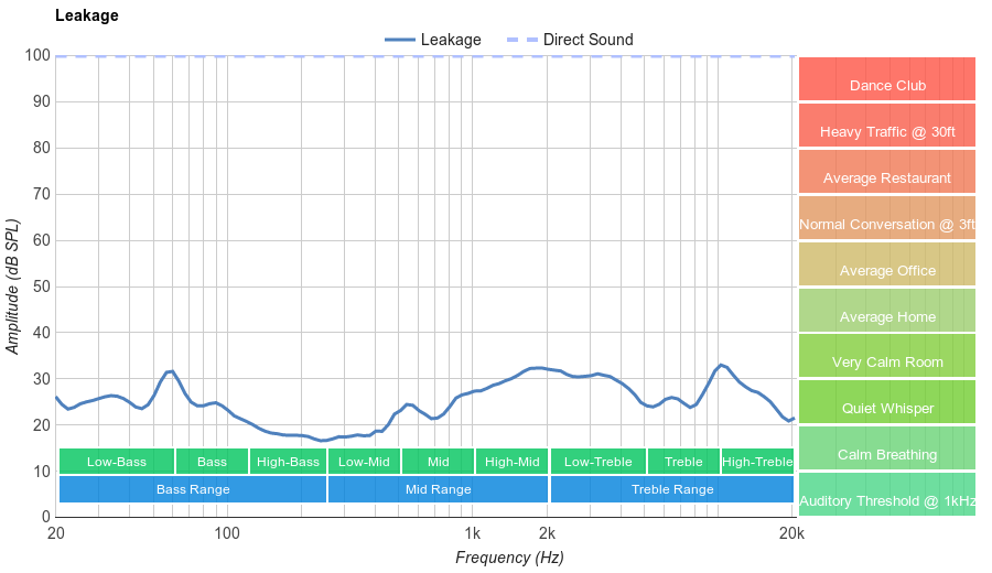 Excellent leakage performance. The closed-back and tight fit of these in-ears don't let much sound out of them. The significant portion of their leakage is between 1KHz and 8KHz, which is broad, but the overall level of the leakage is so low that makes the other variable rather irrelevant. With the music at 100dB SPL, the leakage at 1 foot away averages at about 25dB SPL while peaking at 33dB SPL, which is way below the noise floor of an average office.