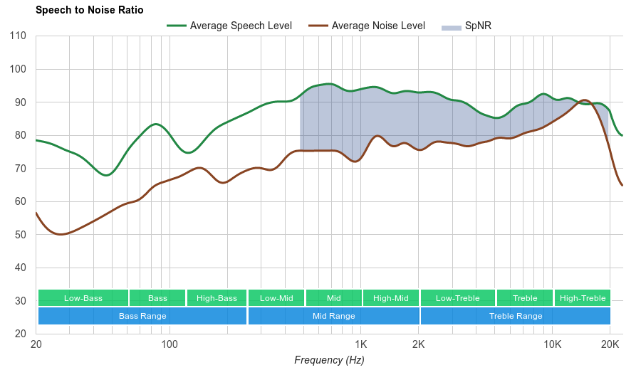 The noise handling of the microphone is mediocre. In our SpNR test, it achieved a speech-to-noise ratio of 12dB. This means they are best suited for quiet environments as they won't be able to fully separate speech from ambient noise even in moderately loud places.
