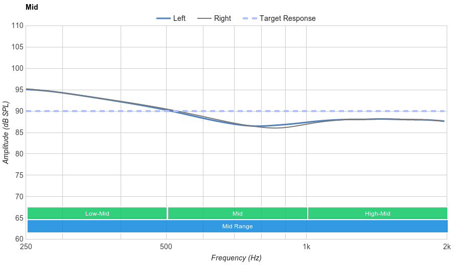 The mid-range performance is very good. The bump in low-mid is actually the continuation of the high-bass overemphasis. This makes the vocals and lead instruments slightly thick, and makes the overall mix a bit cluttered. The underemphasis in mid-mid and high-mid means the mid-range of the HD1 In-Ear sounds a bit recessed, that is, the vocals and lead instruments are nudged towards the back of the mix.