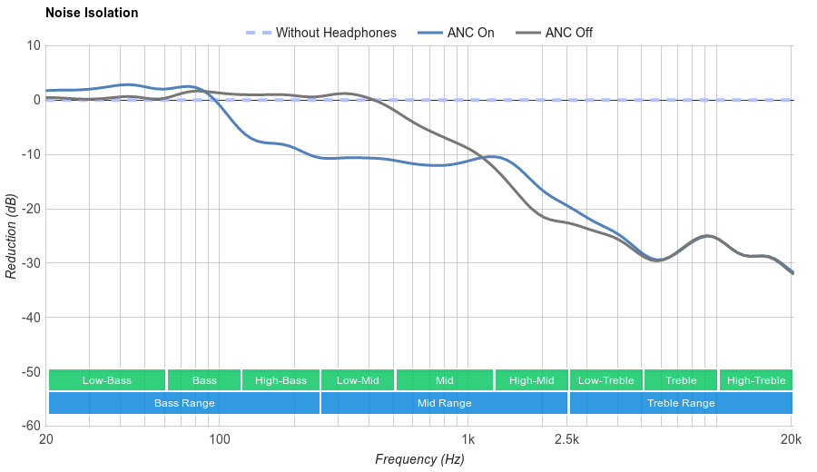Poor isolation overall. The isolation provided passively by the ear cups is decent, considering the on-ear design of these headphones. The mid range performance is also below average, but not too bad, considering the design. However, these headphones don't isolate any bass, and are a little high on self-noise.