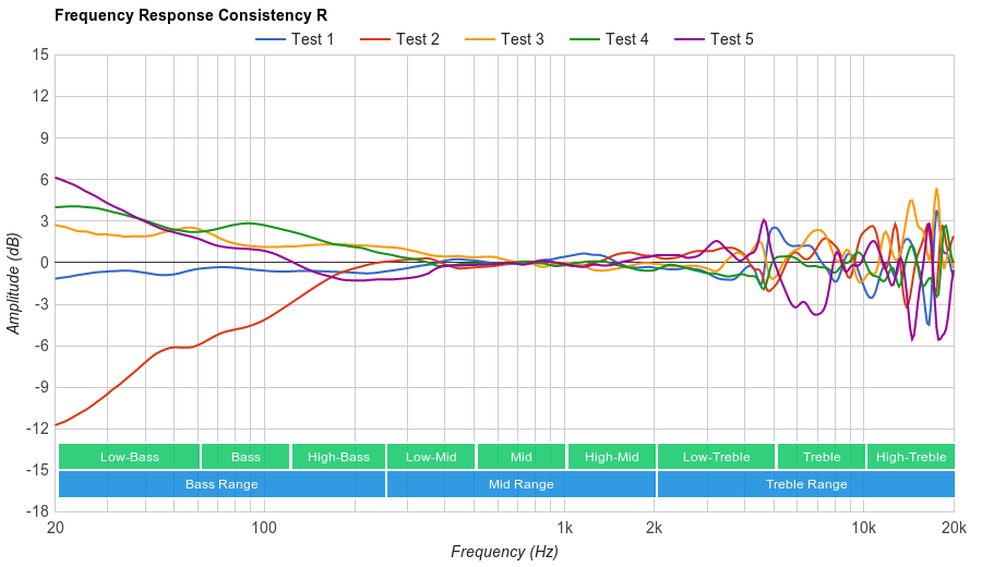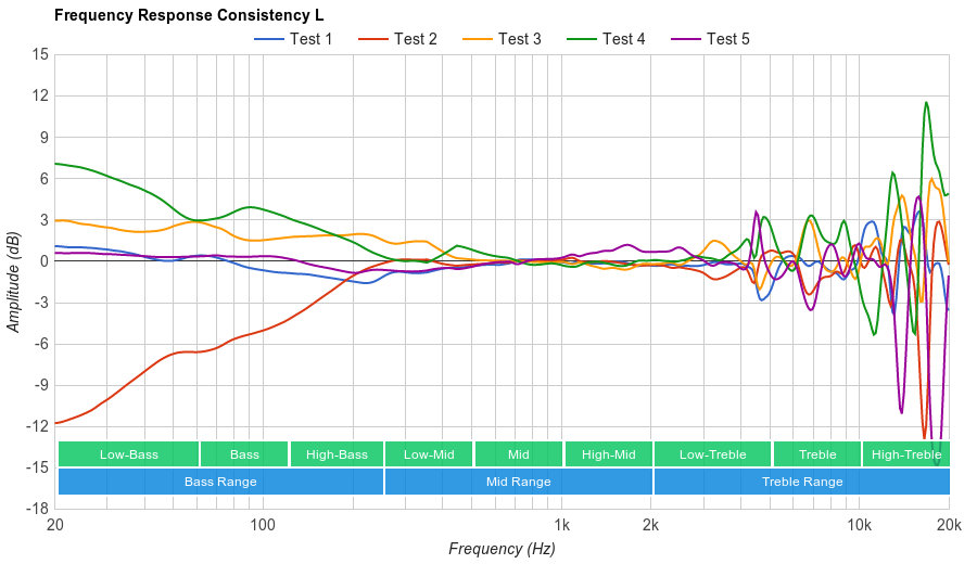 Poor Consistency performance. The Bass Range of our Over-Ear and On-Ear headphones are measured on 5 different human subjects, 5 times each. In the graphs, each line represents an individual's average Bass response. The RS 165 shows about 18dB of variance at 20Hz, which is quite significant and noticeable. The inconsistent Bass performance of these headphones is the result of poor seal/fit, as well as different personal positioning preferences. The Treble Range shows better consistency with about 6dB of variance at 10KHz.