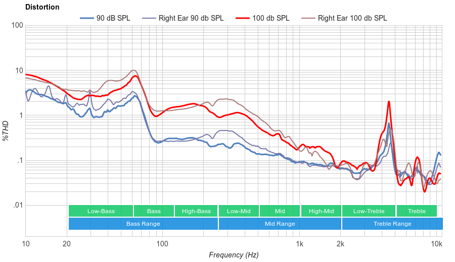 Good Bass Range performance. Low-bass is extended down to 10Hz which is excellent. However, it is hyped by about 3dB, which is going to add excess thump and rumble to the sound. Additionally, the 5dB bump surrounding 100Hz makes the sound of these headphones noticeably boomy and muddy. Also, their bass delivery varies significantly across users, and is sensitive to the quality of fit, seal, and whether you wear glasses. The response here represents the average bass response and your experience may vary.