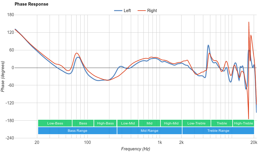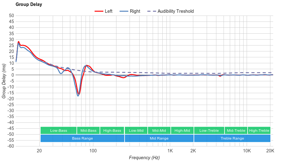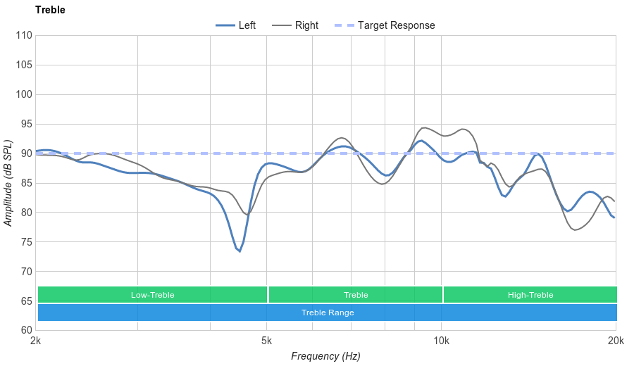 Good Treble Range performance. Low-treble has a dip around 4KHz, but because of the narrow width, its negative effects on presence and detail of vocals/leads would be small. The rest of the Range is within good limits and relatively flat and consistent.