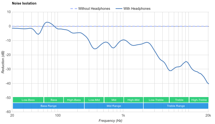 Poor Isolation. The RS 165 don't have active noise cancelling, and their passive isolation doesn't isolate significantly in the Bass Range. In the Mid Range, they achieve about 12dB of reduction, and in the Treble Range they achieve about 27dB of reduction, both values being decent.