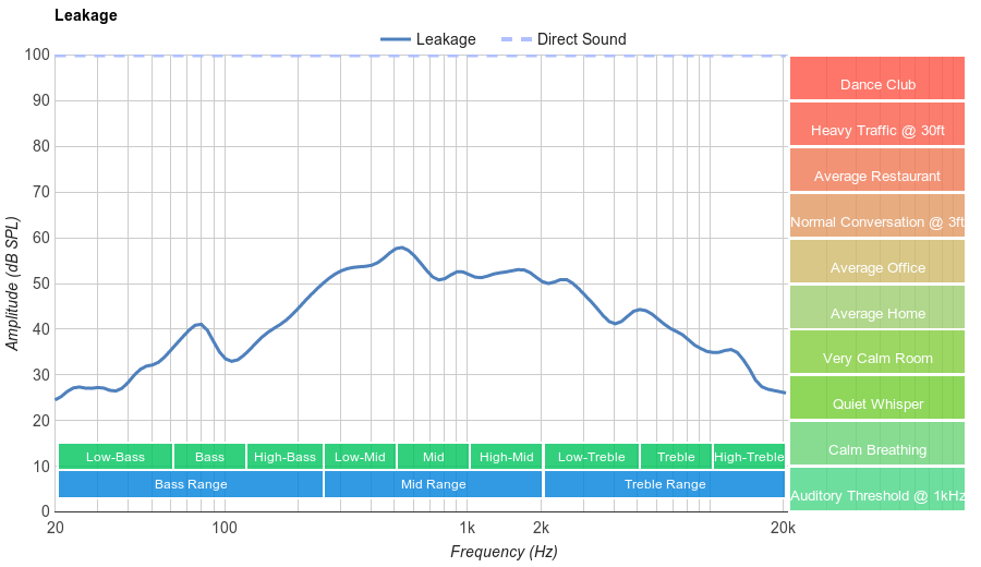 Mediocre Leakage performance. The significant portion of leakage is spread between 300Hz and 3KHz which is a relatively broad range, but limited mostly to the Mid Range. However, the overall level of leakage is not too loud.